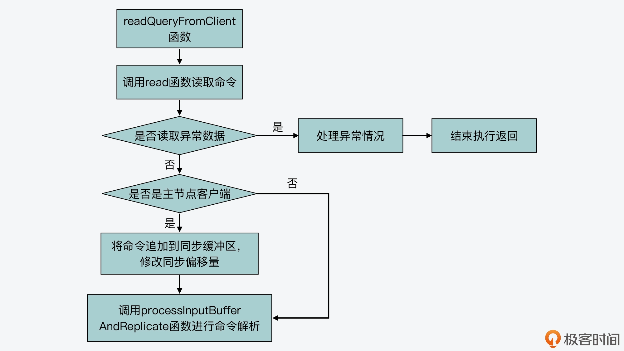 紧接着,readQueryFromClient 函数会根据读取数据的情况,进行一些异常处理,比如数据读取失败或是客户端连接关闭等。此外,如果当前客户端是主从复制中的主节点,readQueryFromClient 函数还会把读取的数据,追加到用于主从节点命令同步的缓冲区中。