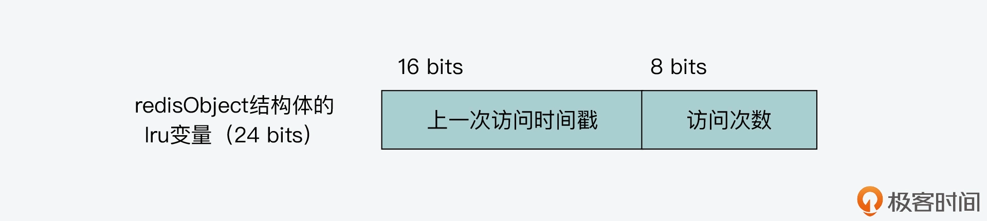 所以,正是基于这样的设计考虑,Redis 源码在实现 LFU 算法时,在键值对的 redisObject 结构体中的 lru 变量里,会同时记录访问次数和访问时间戳。当键值对被再次访问时,lru 变量中的访问次数,会先根据上一次访问距离当前的时长,执行衰减操作,然后才会执行增加操作。