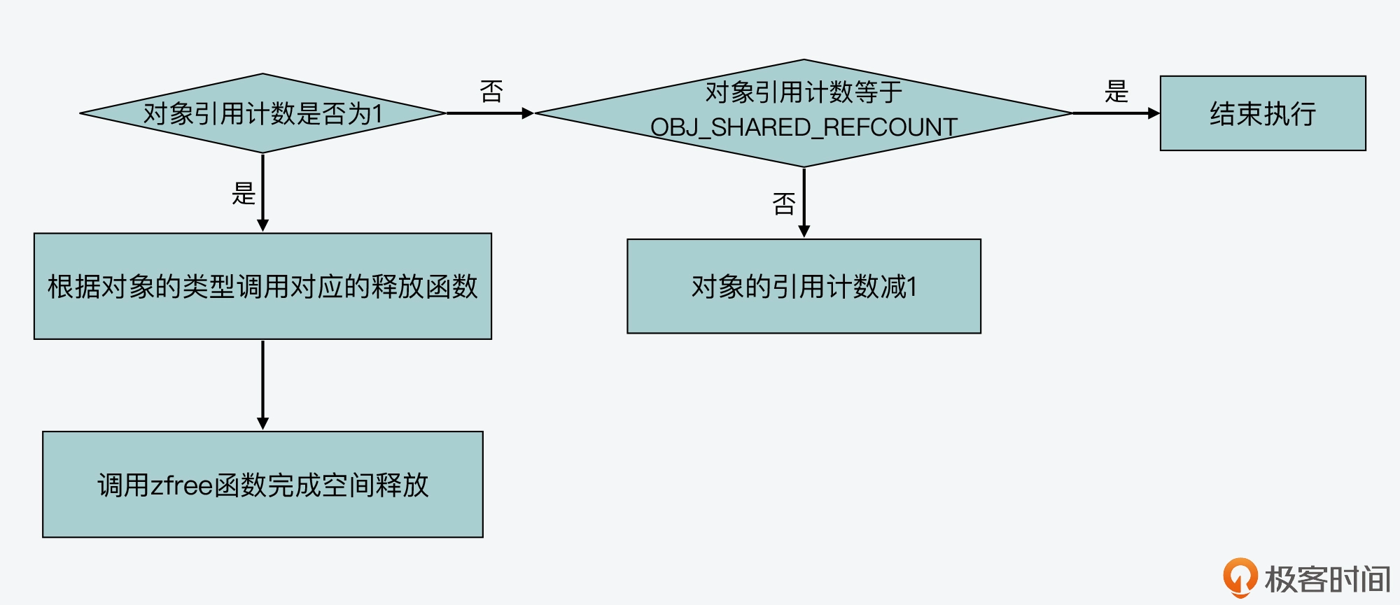 那么在这里,你要知道的是,decrRefCount 函数在执行时,会判断待释放对象的引用计数。只有当引用计数为 1 了,它才会根据待释放对象的类型,调用具体类型的释放函数来释放内存空间。否则的话,decrRefCount 函数就只是把待释放对象的引用计数减 1。