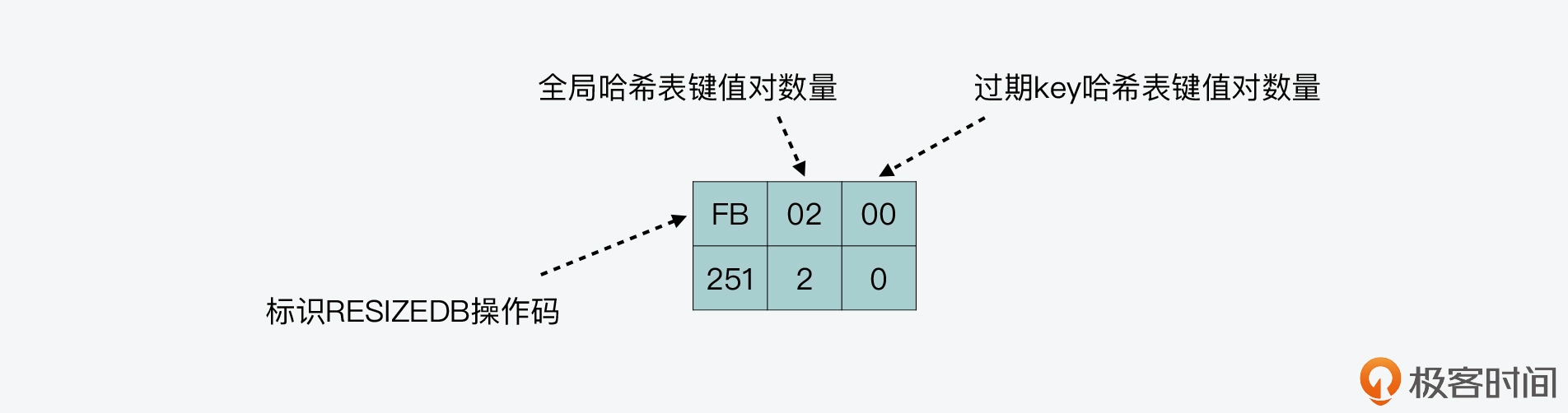 我也把刚才创建的 RDB 文件中,RESIZEDB 操作码的内容画在了下图中,你可以看下。