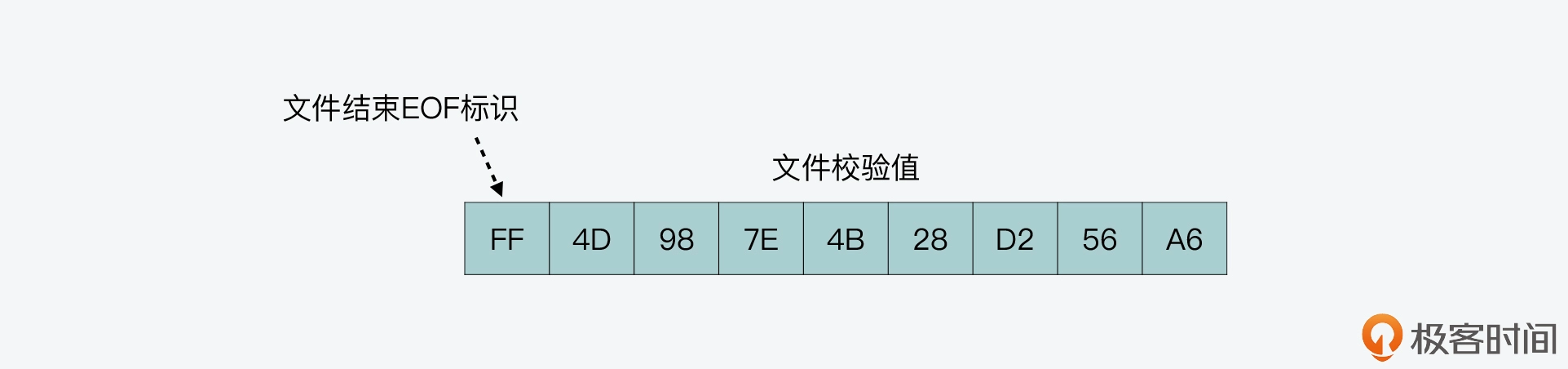 • 文件尾:这部分保存了 RDB 文件的结束标识符,以及整个文件的校验值。这个校验值用来在 Redis server 加载 RDB 文件后,检查文件是否被篡改过。