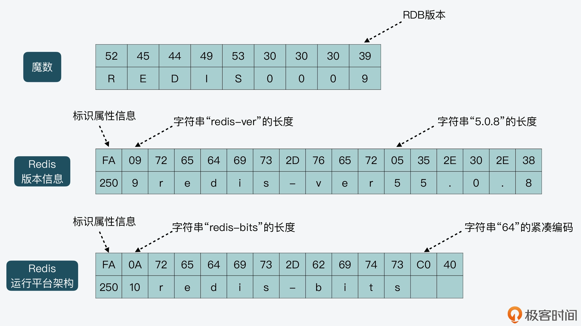 到这里,RDB 文件头的内容已经写完了。我把刚才创建的 RDB 文件头的部分内容,画在了下图当中,并且标识了十六进制对应的 ASCII 字符以及一些关键信息,你可以结合图例来理解刚才介绍的代码。