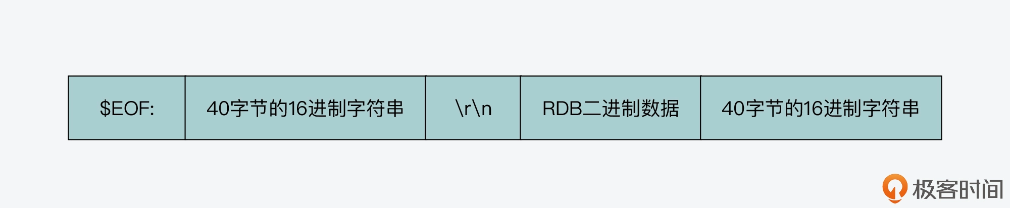 而为了让从节点能够识别用来同步数据的 RDB 内容,rdbSaveToSlavesSockets 函数调用 rdbSaveRioWithEOFMark 函数(在 rdb.c 文件中),在 RDB 二进制数据的前后加上了标识字符串,如下图所示: