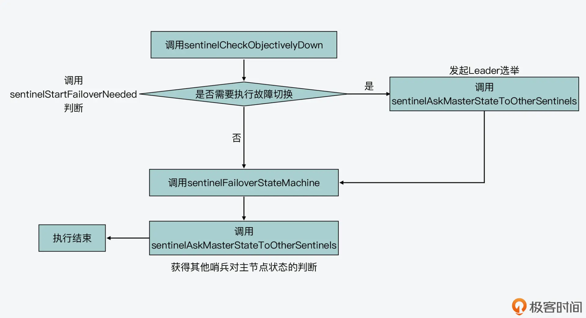 从图中可以看到,sentinelHandleRedisInstance 会先调用 sentinelCheckObjectivelyDown 函数,再调用 sentinelStartFailoverIfNeeded 函数,判断是否要开始故障切换,如果 sentinelStartFailoverIfNeeded 函数的返回值为非 0 值,那么 sentinelAskMasterStateToOtherSentinels 函数会被调用。否则的话,sentinelHandleRedisInstance 就直接调用 sentinelFailoverStateMachine 函数,并再次调用 sentinelAskMasterStateToOtherSentinels 函数。
