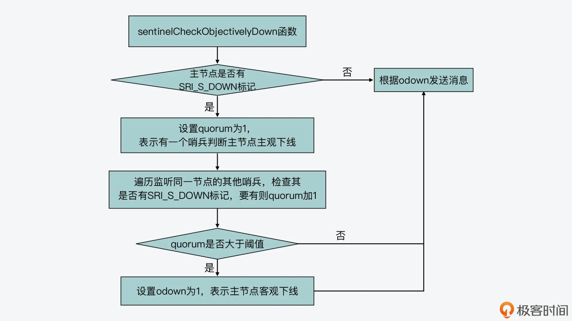 而 sentinelCheckObjectivelyDown 函数在执行时,除了会检查当前哨兵对主节点主观下线的判断结果,还需要结合监听相同主节点的其他哨兵,对主节点主观下线的判断结果。它把这些判断结果综合起来,才能做出主节点客观下线的最终判断。