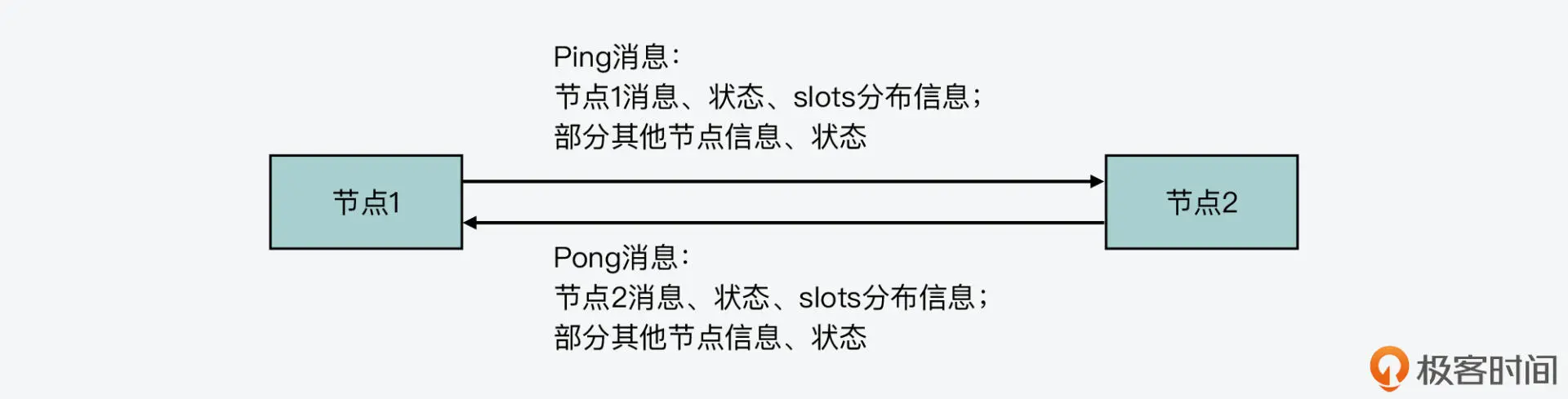 对于 Redis 来说,集群节点信息包括了节点名称、IP、端口号等,而节点运行状态主要用两个时间来表示,分别是节点向其他节点发送 PING 消息的时间,以及它自己收到其他节点返回的 PONG 消息的时间。最后,集群中数据的分布情况,在 Redis 中就对应了 Redis Cluster 的 slots 分配情况,也就是每个节点拥有哪些 slots。