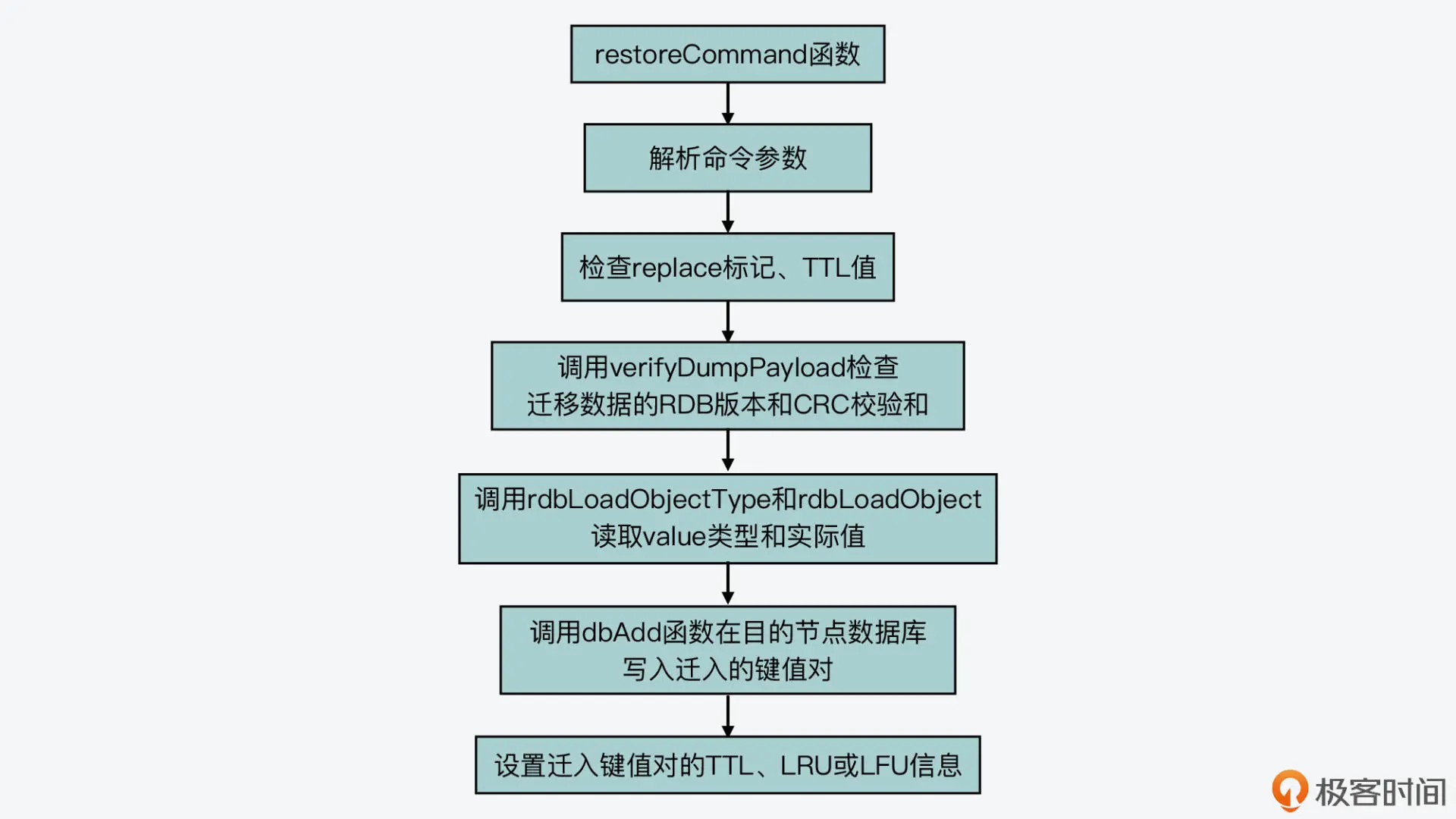 最后,restoreCommand 函数会调用 dbAdd 函数,把解析得到 key 和 value 写入目的节点的数据库中。这里,你要注意的是,如果迁移命令中带有 REPLACE 标记,那么,restoreCommand 函数会先调用 dbDelete 函数,删除在目的节点数据库中已经存在的迁移 key,然后再调用 dbAdd 函数写入迁移 key。此外,restoreCommand 函数还会设置迁移 key 的过期时间,以及 LRU 或 LFU 信息,并最终返回成功信息。