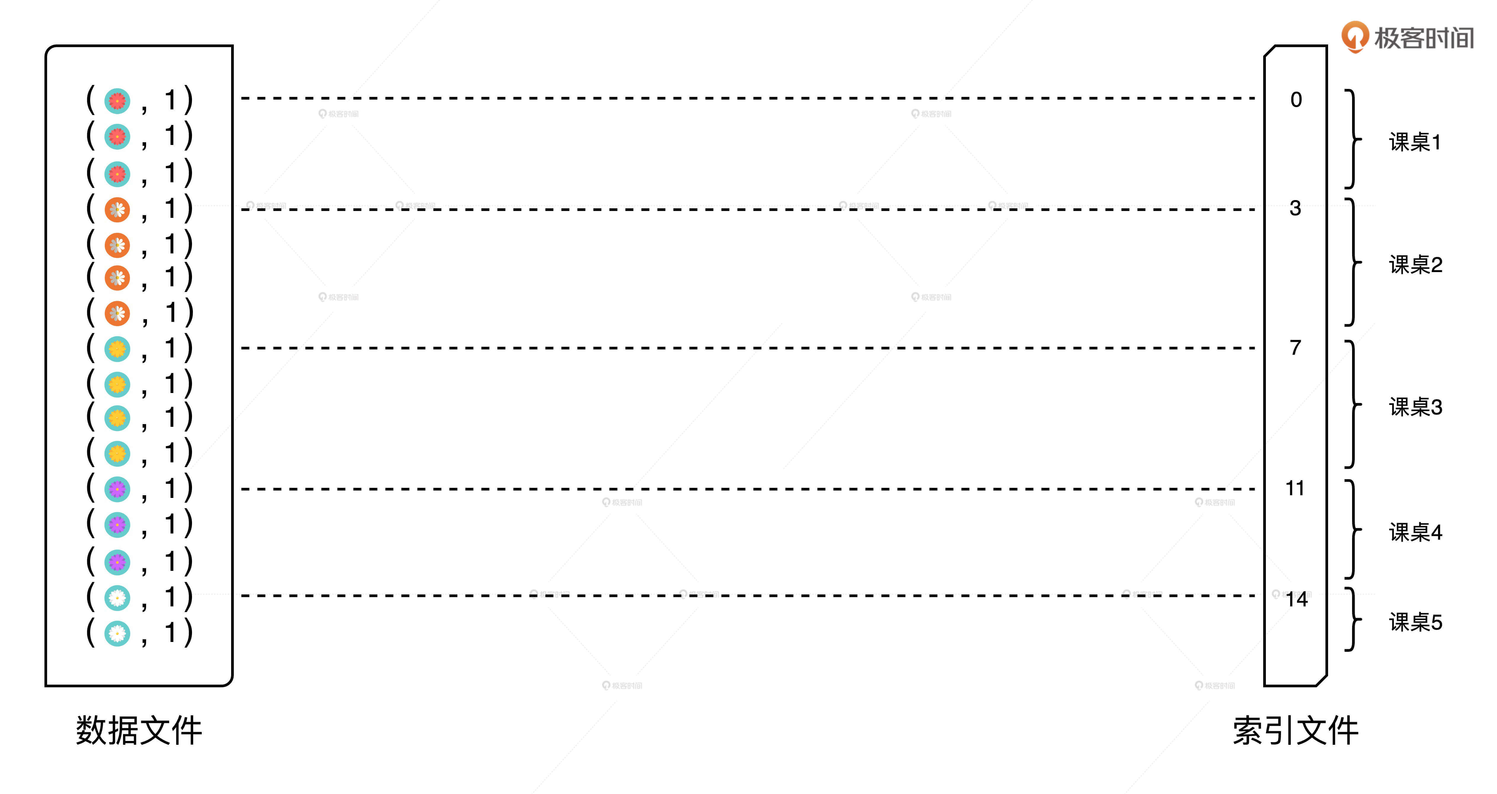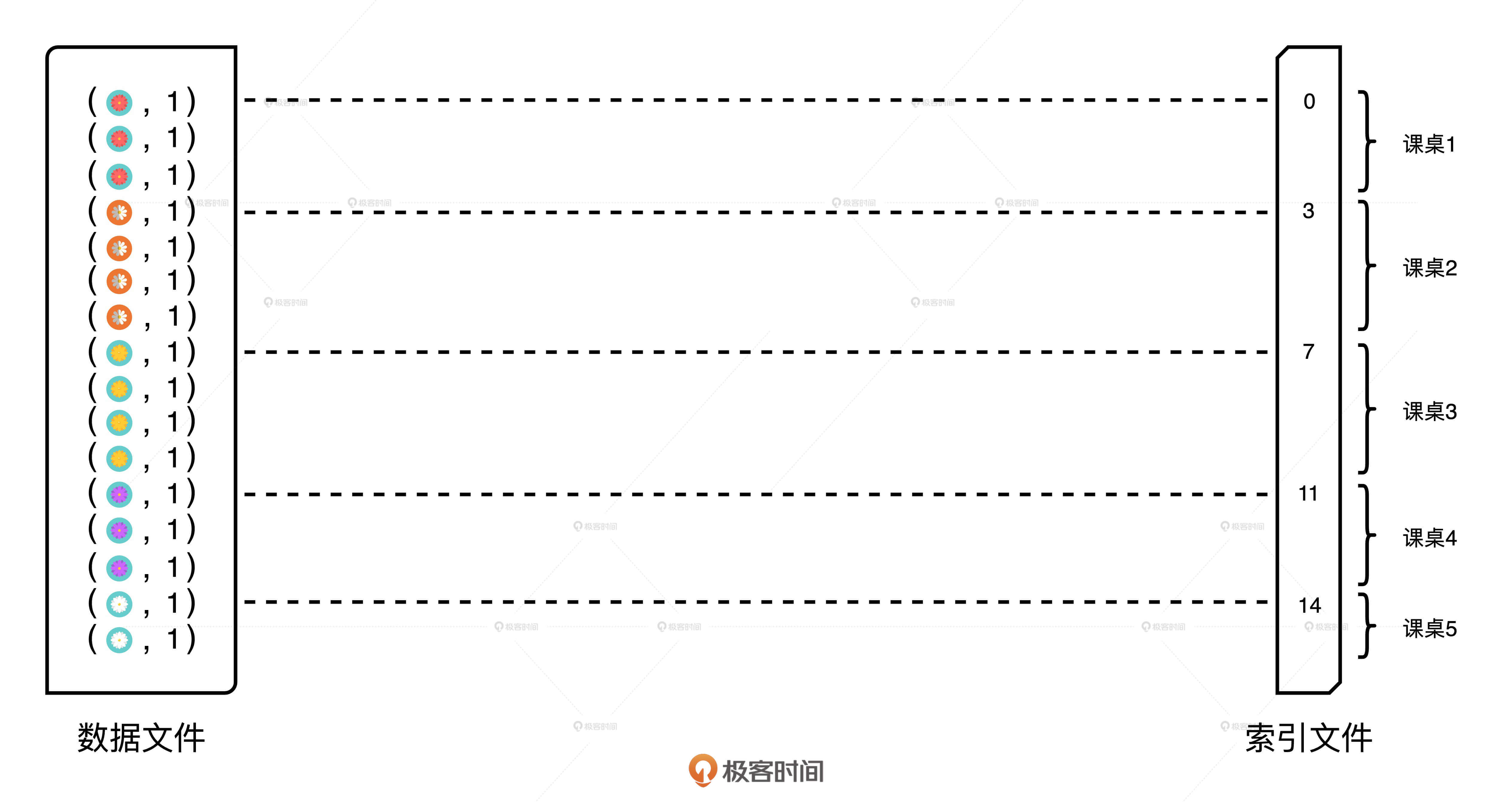 之前我们也说过,Map阶段最终生产的数据会以中间文件的形式物化到磁盘中,这些中间文件就存储在spark.local.dir设置的文件目录里。中间文件包含两种类型:一类是后缀为data的数据文件,存储的内容是Map阶段生产的待分发数据;另一类是后缀为index的索引文件,它记录的是数据文件中不同分区的偏移地址。这里的分区是指Reduce阶段的分区,因此,分区数量与Reduce阶段的并行度保持一致。