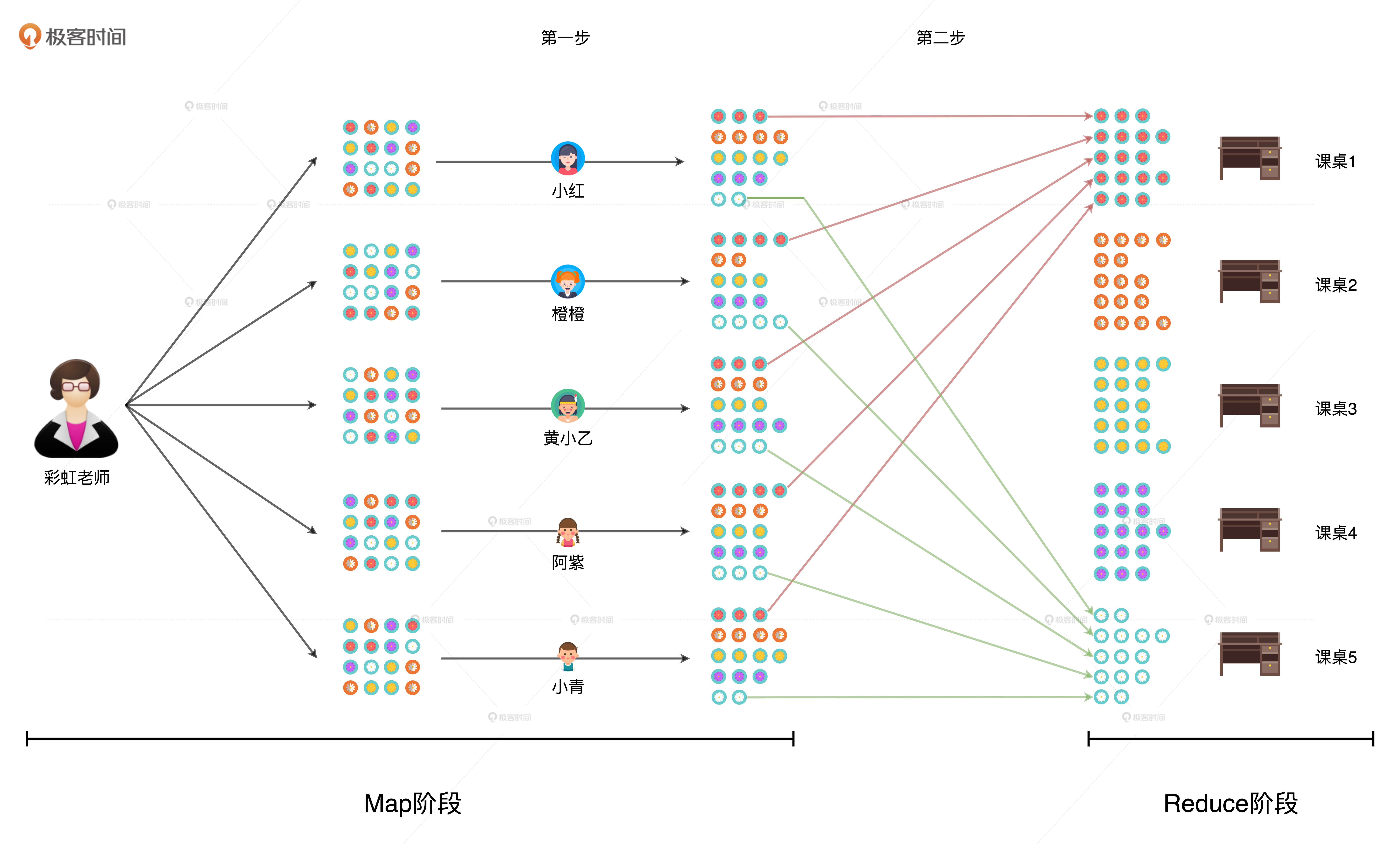 最后,我们再来说说Reduce阶段,在“仙女散花”的游戏里,每个人把自己的花朵归好类之后,主动地把不同颜色的花朵放到相应的课桌上,这个过程实际上就是Shuffle过程中的数据分发。不过,与课桌被动地接收花朵不同的是,Shuffle在Reduce阶段是主动地从Map端的中间文件中拉取数据。