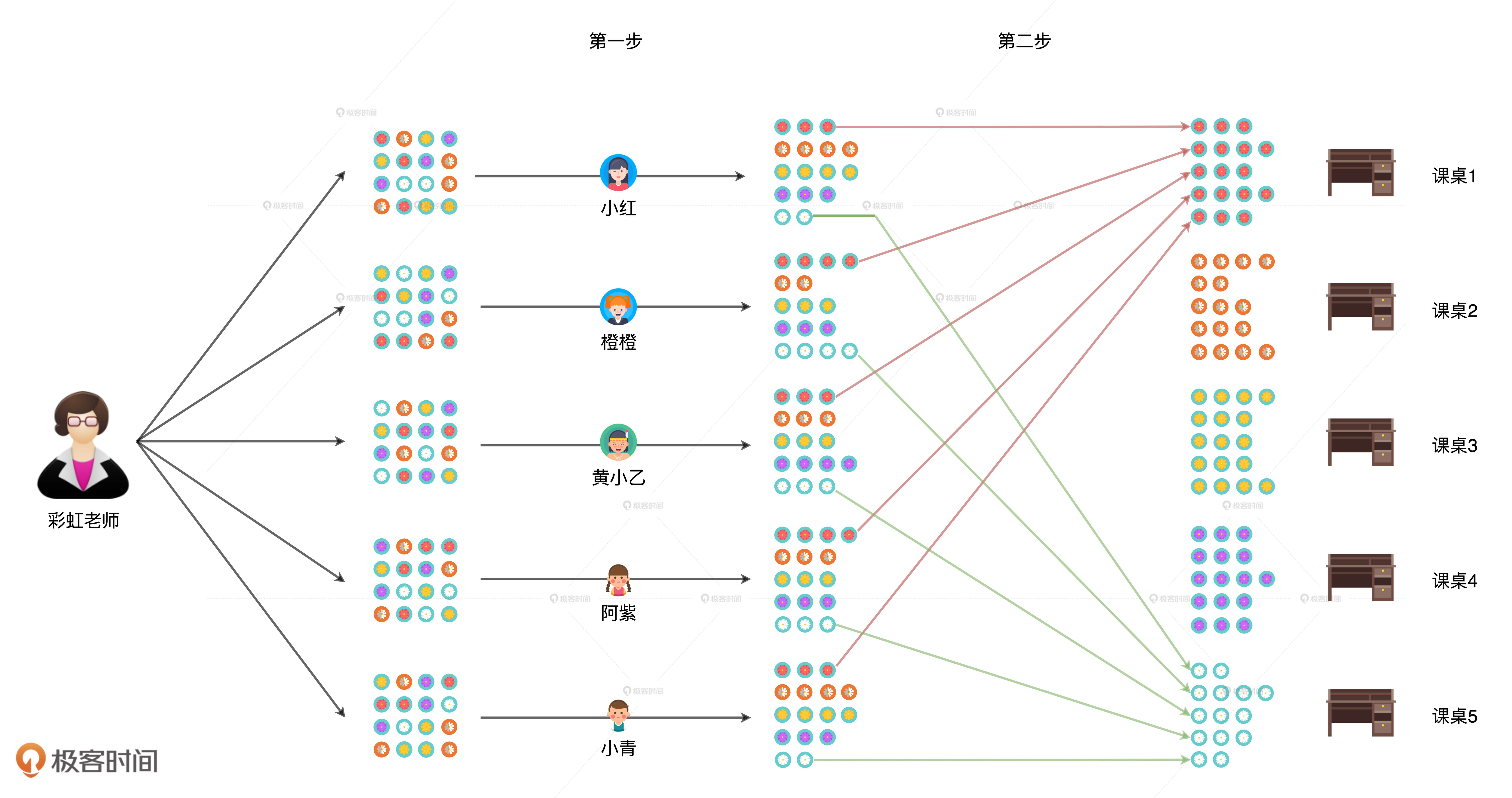 在仙女散花的游戏中,从老师分发花朵,到5个小同学把花朵按照颜色归类,对应的是Shuffle的Map阶段,而大家把归类的花朵分发到相应的课桌,这个过程类似于Shuffle的Reduce阶段。