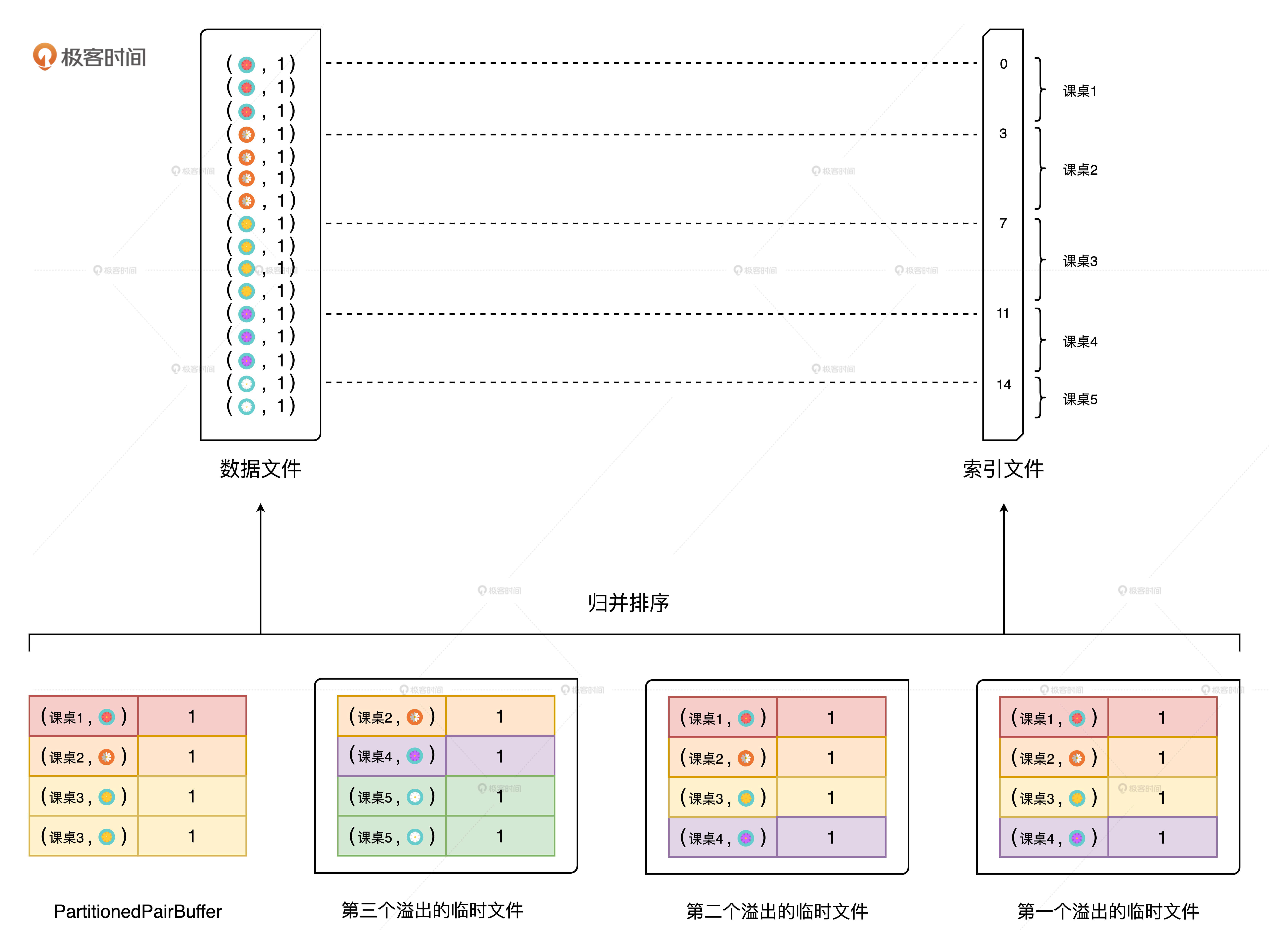 就这样,PartitionedPairBuffer腾挪了一次又一次,数据分区0里面的花朵处理了一批又一批,直到所有的花朵都被处理完。分区0有16朵花,PartitionedPairBuffer的大小是4,因此,PartitionedPairBuffer总共被腾挪了3次,生成了3个临时文件,每个临时文件中包含4条数据记录。16条数据,有12条分散在3个文件中,还有4条缓存在PartitionedPairBuffer里。