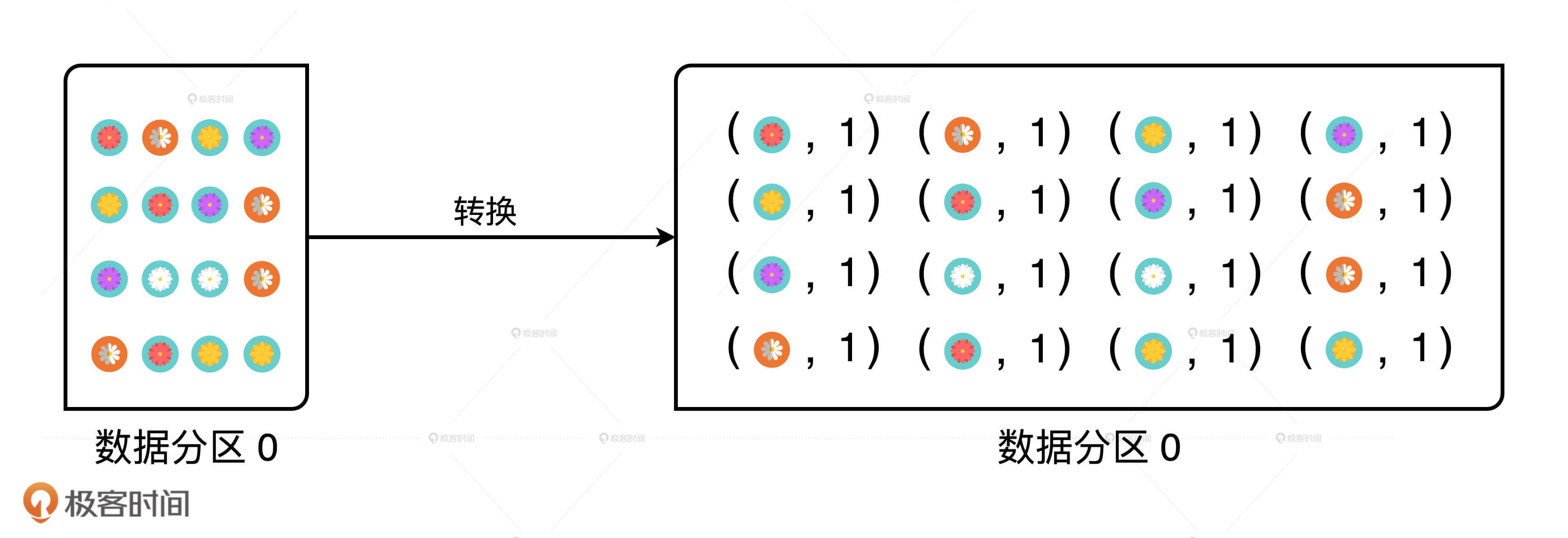 我们可以看到,代码步骤与游戏过程基本上一一对应。但是,读取完花朵文件之后,由于groupByKey是pairRDD算子,需要消费(Key,Value)形式的数据,因此我们需要对原始花朵数据做一次转换。以数据分区0为例,数据的转换过程如下图所示,你不妨把数据分区0理解为是黄老师分发给小红的花朵。