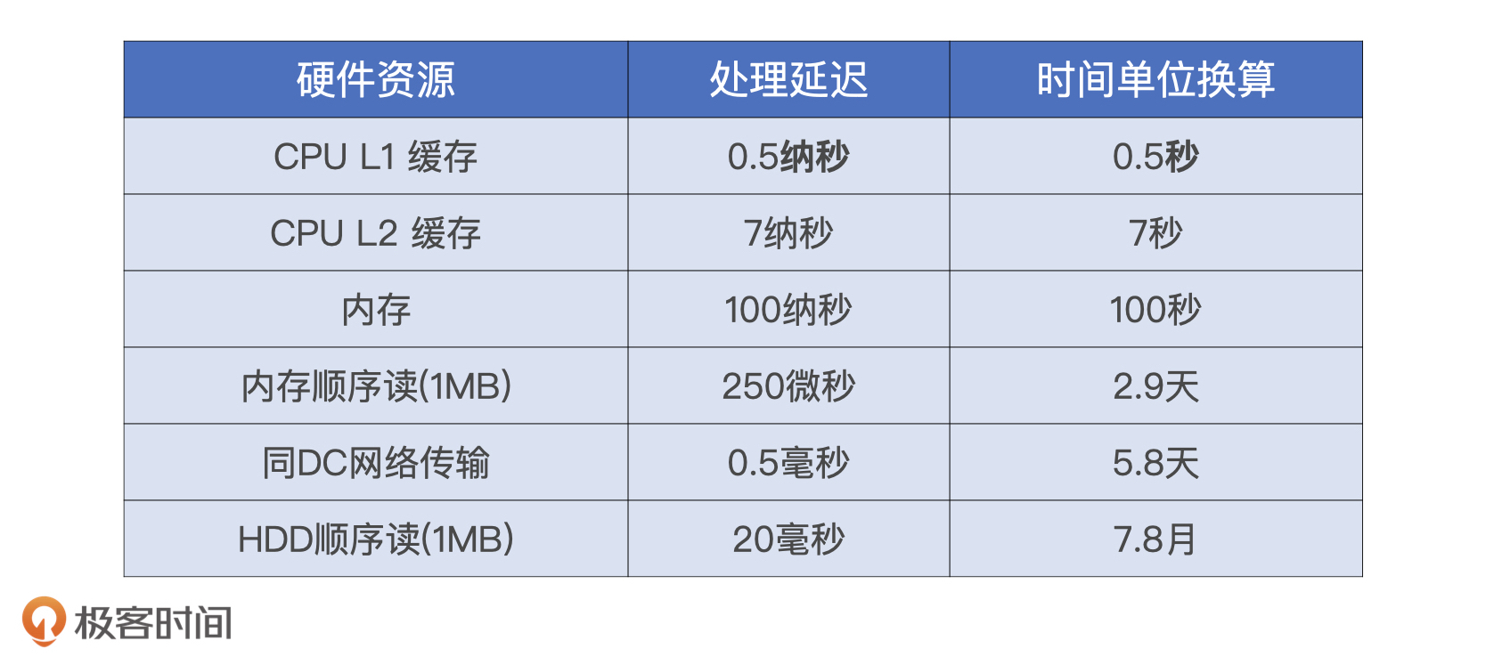 其次,Shuffle消耗的不同硬件资源之间很难达到平衡。磁盘和网络的消耗是Shuffle中必需的环节。但是,磁盘与网络的处理延迟相比CPU和内存要相差好几个数量级。以下表为例,如果以CPU L1缓存的处理延迟为基准,把单位从纳秒校准到秒,我们就会惊讶地发现,当CPU、内存以秒为单位处理数据时,磁盘和网络的处理延迟是以天、月为单位的!