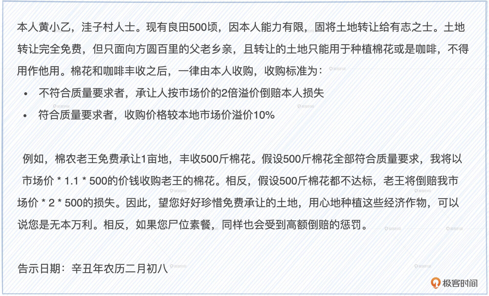 于是,黄小乙追加了一项补充条款:“鉴于老乡们参与热情高涨,公平起见,我又制定了新的土地转让规则:首先,每位老乡能够获得的土地面积有上下限,它的具体数值由可耕种土地总面积和申请人数共同决定;其次,土地转让权的有效时间与农作物生长周期一致,一旦作物丰收,承让人需让出土地,如有意愿再次耕种需重新申请。”