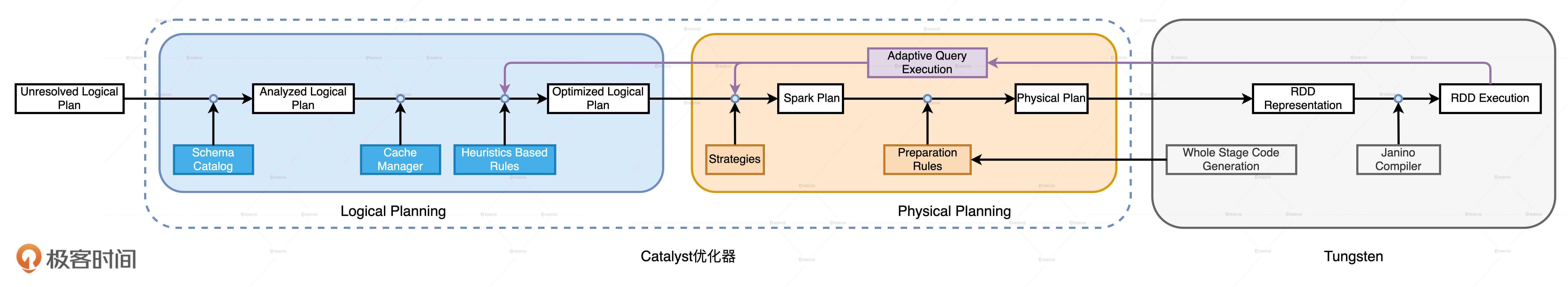 根据DataFrame简单的标量算子和明确的Schema定义,借助Catalyst优化器和Tungsten,Spark SQL有能力在运行时,构建起一套端到端的优化机制。这套机制运用启发式的规则与策略和运行时的执行信息,将原本次优、甚至是低效的查询计划转换为高效的执行计划,从而提升端到端的执行性能。