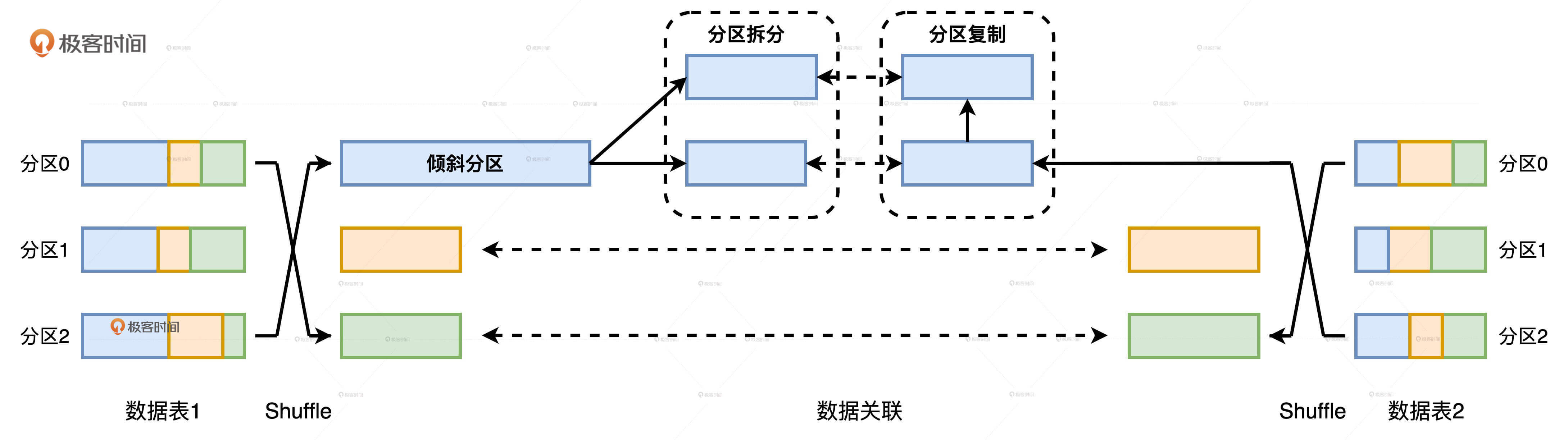 另外,在数据关联的场景中,对于参与Join的两张表,我们暂且把它们记做数据表1和数据表2,如果表1存在数据倾斜,表2不倾斜,那在关联的过程中,AQE除了对表1做拆分之外,还需要对表2对应的数据分区做复制,来保证关联关系不被破坏。