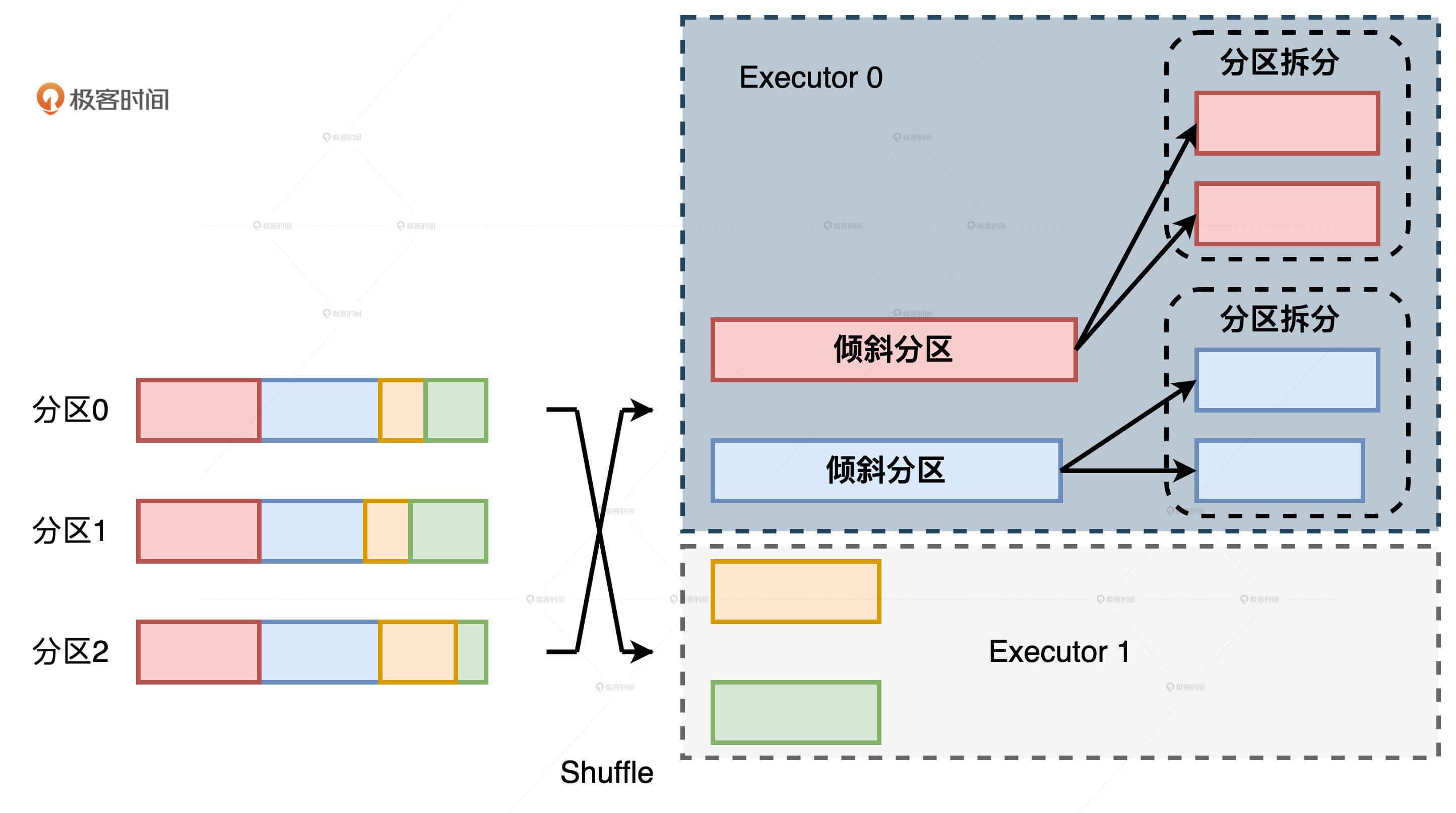 我们来举个例子,假设有个Shuffle操作,它的Map阶段有3个分区,Reduce阶段有4个分区。4个分区中的两个都是倾斜的大分区,而且这两个倾斜的大分区刚好都分发到了Executor 0。通过下图,我们能够直观地看到,尽管两个大分区被拆分,但横向来看,整个作业的主要负载还是落在了Executor 0的身上。Executor 0的计算能力依然是整个作业的瓶颈,这一点并没有因为分区拆分而得到实质性的缓解。