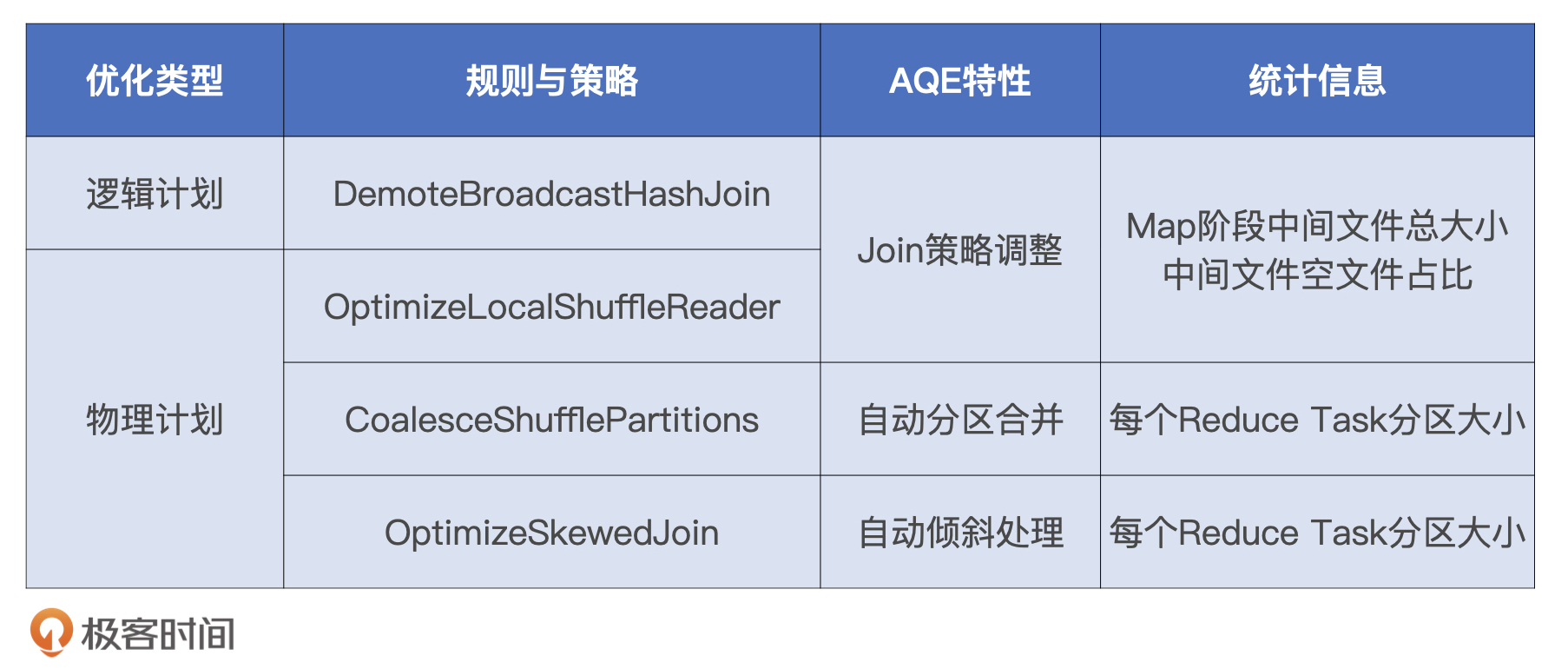 AQE既定的规则和策略主要有4个,分为1个逻辑优化规则和3个物理优化策略。我把这些规则与策略,和相应的AQE特性,以及每个特性仰仗的统计信息,都汇总到了如下的表格中,你可以看一看。
