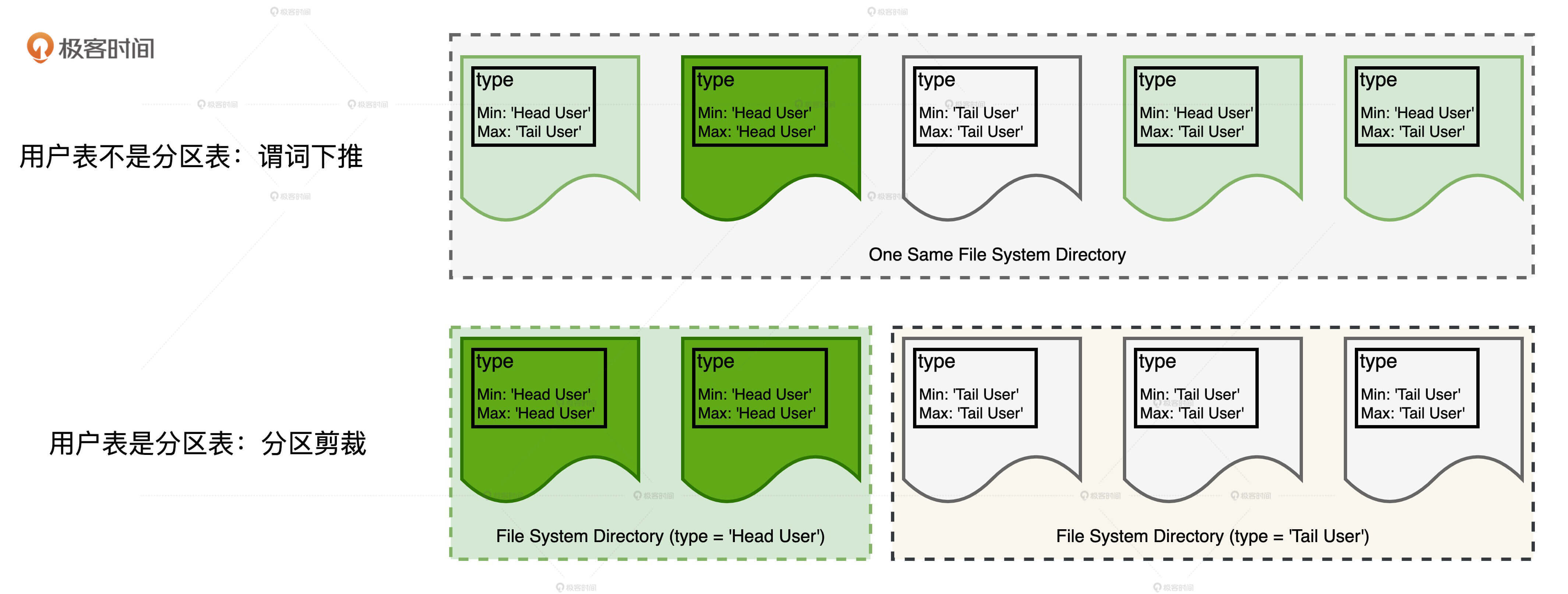 通过与谓词下推作对比,我们可以直观地感受分区剪裁的威力。如图所示,上下两行分别表示用户表在不做分区和做分区的情况下,Spark SQL对于用户表的数据扫描。在不做分区的情况下,用户表所有的数据分片全部存于同一个文件系统目录,尽管Parquet格式在注脚(Footer)中提供了type字段的统计值,Spark SQL可以利用谓词下推来减少需要扫描的数据分片,但由于很多分片注脚中的type字段同时包含‘Head User’和‘Tail User’(第一行3个浅绿色的数据分片),因此,用户表的数据扫描仍然会涉及4个数据分片。