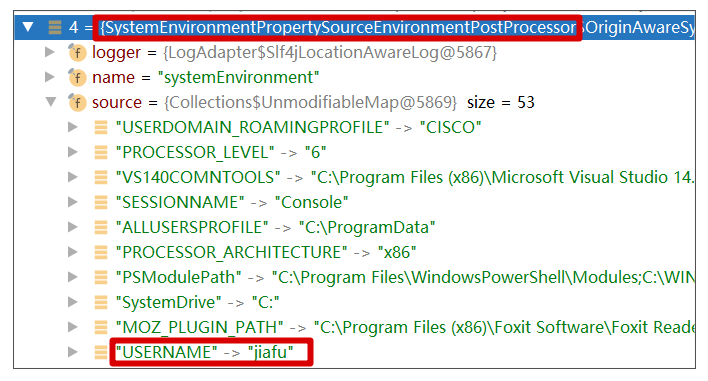 但是如果我们这么改的话,其实还是不行的。实际上,通过之前的调试方法,我们可以找到类似的原因,在systemProperties这个PropertiesPropertySource源中刚好存在user.name,真是无巧不成书。所以命名时,我们一定要注意不仅要避免和环境变量冲突,也要注意避免和系统变量等其他变量冲突,这样才能从根本上解决这个问题。