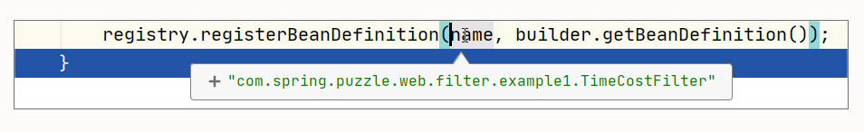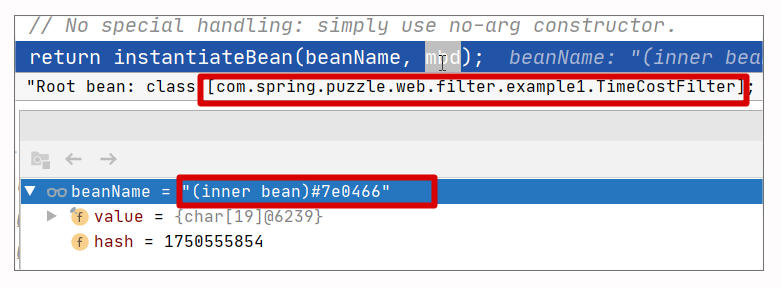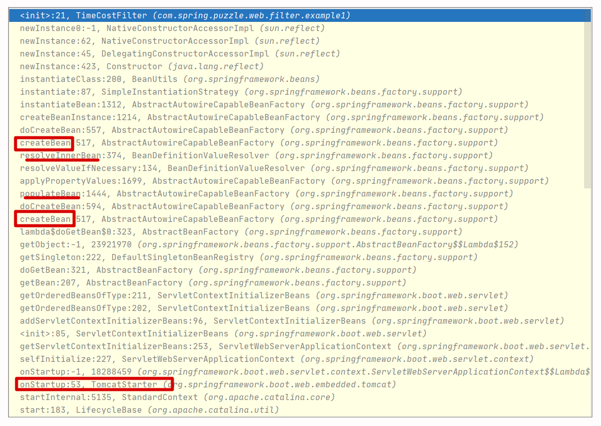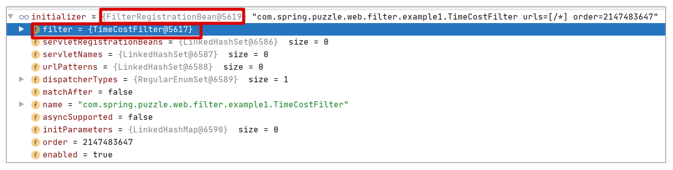 此时,我们想要的 Bean 被“张冠李戴”成 FilterRegistrationBean,但是 TimeCostFilter 是何时实例化的呢?为什么它没有成为一个普通的 Bean?