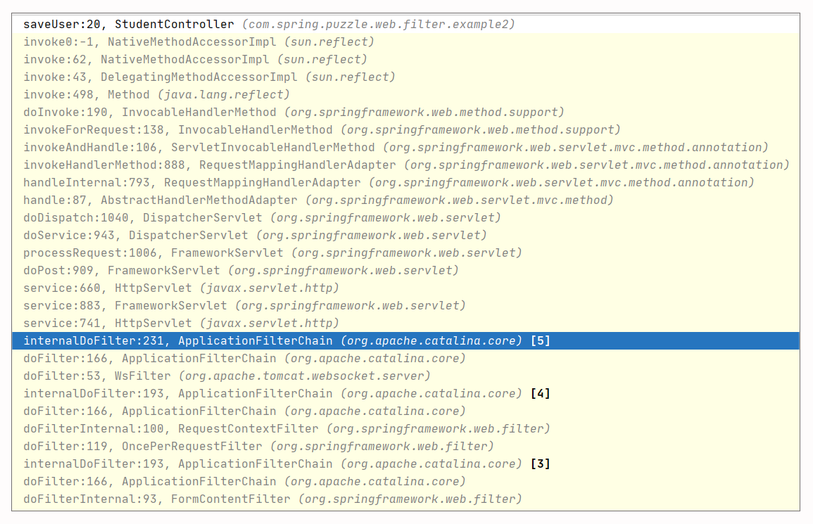 执行完所有的过滤器后,代码调用了 servlet.service(request, response) 方法。从下面这张调用栈的截图中,可以看到,经历了一个很长的看似循环的调用栈,我们终于从 internalDoFilter() 执行到了Controller层的saveUser()。这个过程就不再一一细讲了。