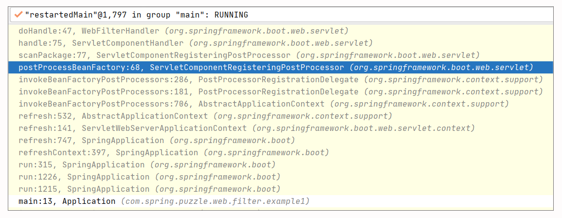 从堆栈上,我们可以看出对@WebFilter 的处理是在 Spring Boot 启动时,而处理的触发点是 ServletComponentRegisteringPostProcessor 这个类。它继承了 BeanFactoryPostProcessor 接口,实现对 @WebFilter、@WebListener、@WebServlet 的扫描和处理,其中对于@WebFilter 的处理使用的就是上文中提到的 WebFilterHandler。这个逻辑可以参考下面的关键代码:
