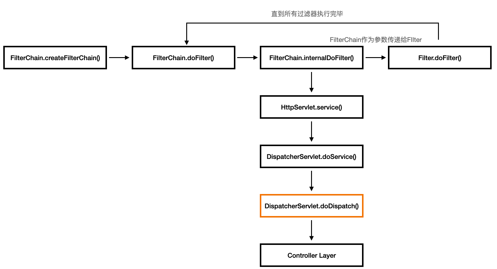 其实说到这里,我们已经了解到过滤器内异常无法被统一处理的大致原因,就是因为异常处理发生在上图的红色区域,即DispatcherServlet中的doDispatch(),而此时,过滤器已经全部执行完毕了。