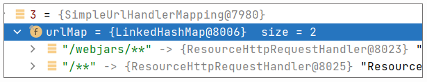 从而验证我们一开始得出的结论,此处添加了两个 ResourceHandler,一个是用来处理请求路径/webjars/*_*_, 而另一个是/**。