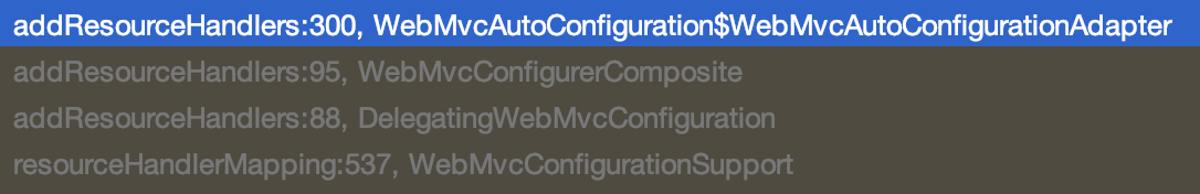 可以了解到,当前方法中的 addResourceHandlers() 最终执行到了 WebMvcAutoConfiguration 类中的 addResourceHandlers(),通过这个方法,我们可以知道当前有哪些 ResourceHandler 的集合被注册到了Spring容器中: