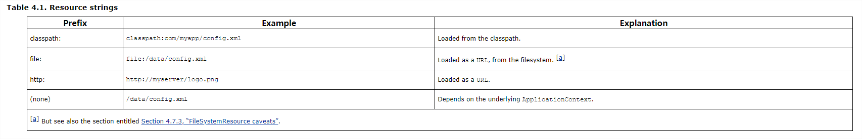 这里,我们可以通过 Spring 的官方文档简单了解下不同加载方式的区别,参考 https://docs.spring.io/spring-framework/docs/2.5.x/reference/resources.html: