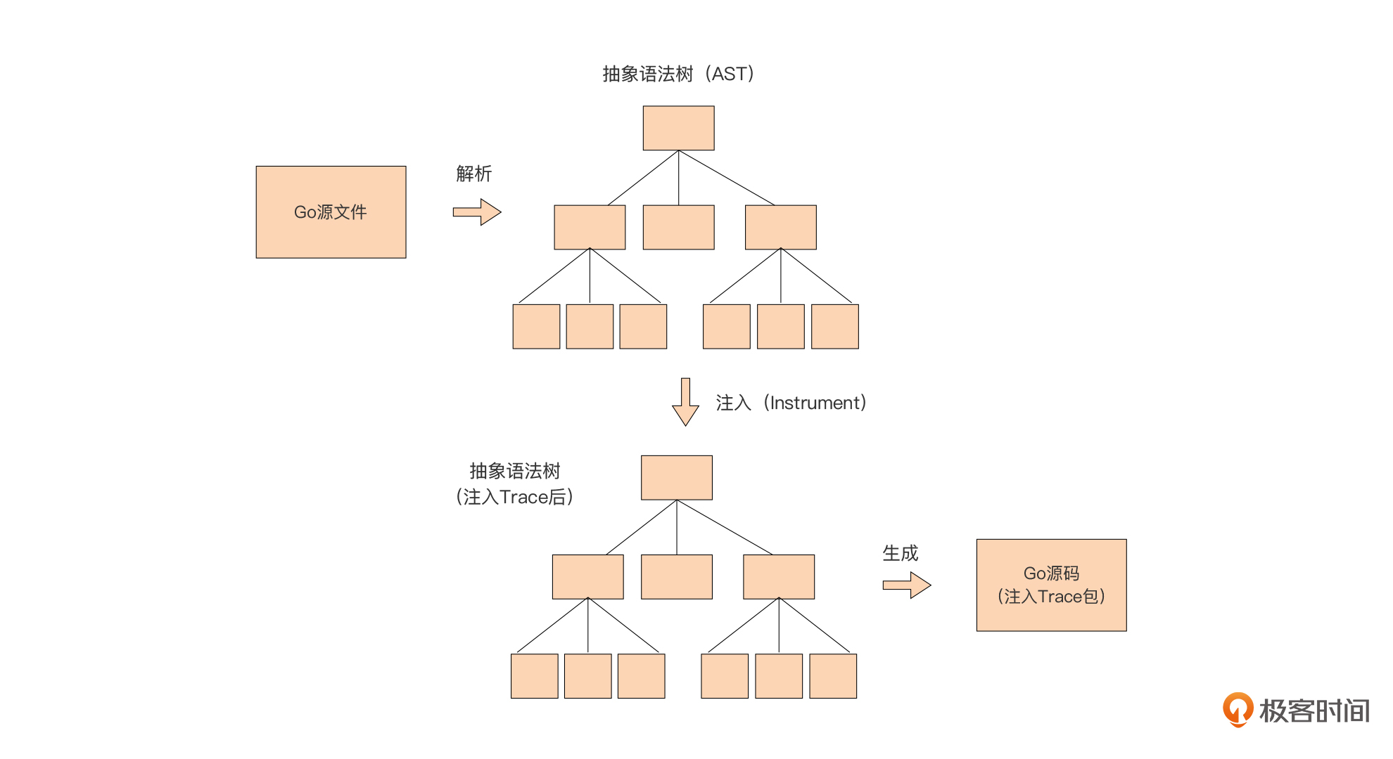 从原理图中我们可以清楚地看到,在这一实现方案中,我们先将传入的Go源码转换为抽象语法树。