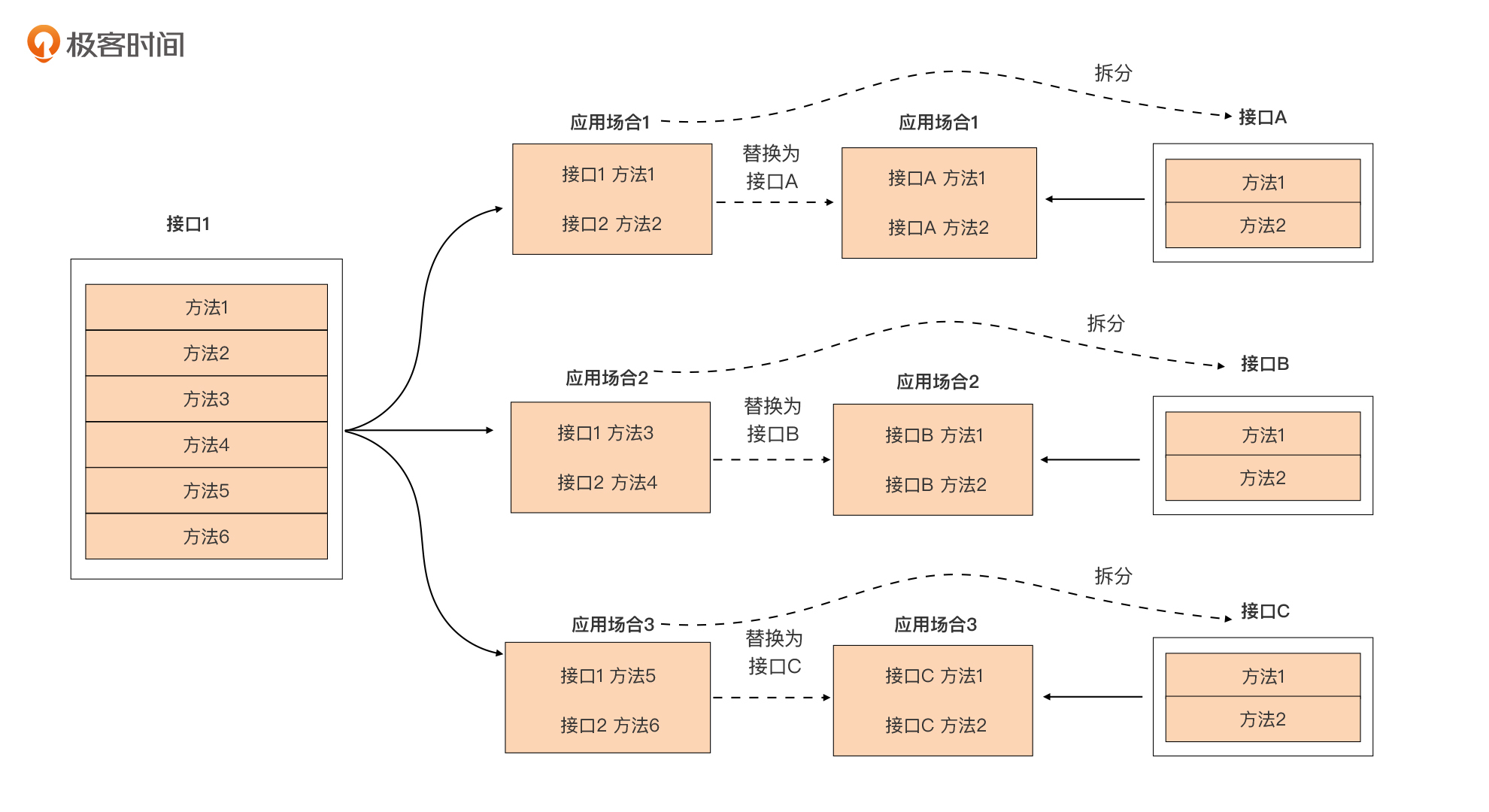 有了接口后,我们就会看到接口被用在了代码的各个地方。一段时间后,我们就来分析哪些场合使用了接口的哪些方法,是否可以将这些场合使用的接口的方法提取出来,放入一个新的小接口中,就像下面图示中的那样: