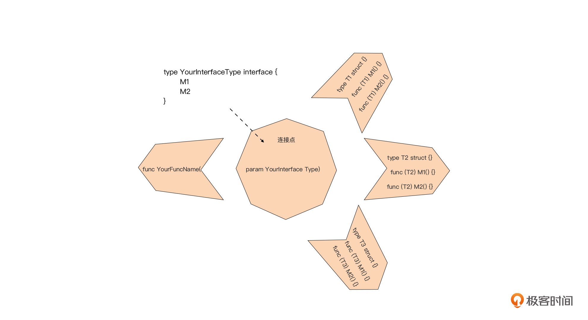 我们看到,函数/方法参数中的接口类型作为“关节(连接点)”,支持将位于多个包中的多个类型与YourFuncName函数连接到一起,共同实现某一新特性。