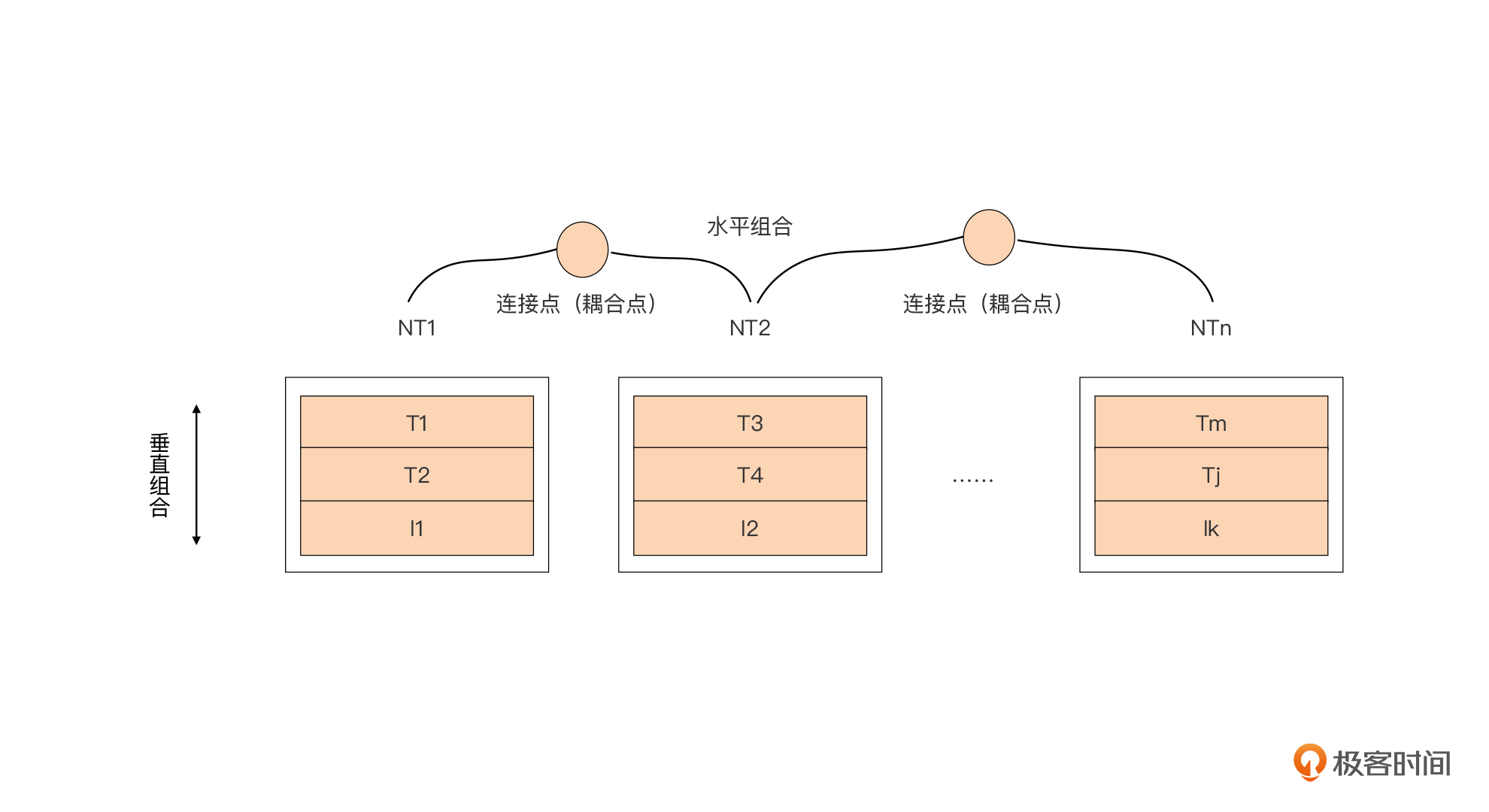 垂直组合更多用在将多个类型(如上图中的T1、I1等)通过“类型嵌入(Type Embedding)”的方式实现新类型(如NT1)的定义。