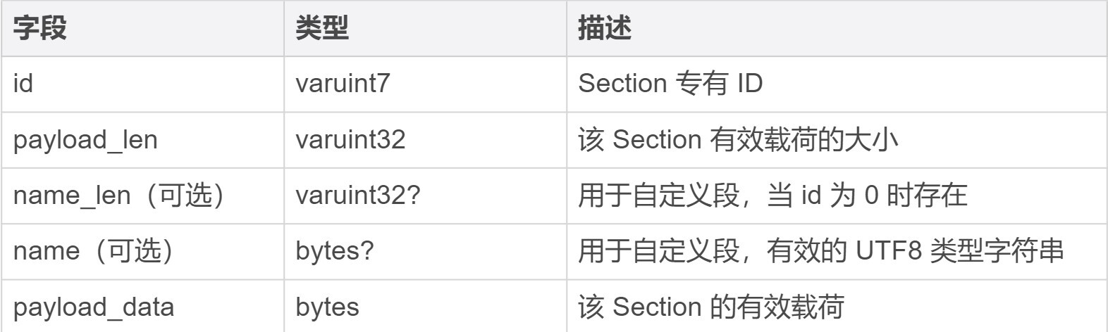 从整体上来看,同 ELF 二进制文件类似,Wasm 模块的二进制数据也是以 Section 的形式被安排和存放的。Section 翻译成中文是“段”,但为了保证讲解的严谨性,以及你在理解上的准确性,后文我会直接使用它的英文名词 Section。