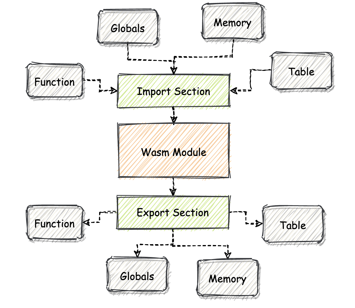 为此,我们便可以利用名为 “Export Section” 的 Section 结构。Export Section 的 ID 为 7,通过它,我们可以将一些资源导出到虚拟机所在的宿主环境中。允许被导出的资源类型同 Import Section 的可导入资源一致。而导出的资源应该如何被表达及处理,则需要由宿主环境运行时的具体实现来决定。