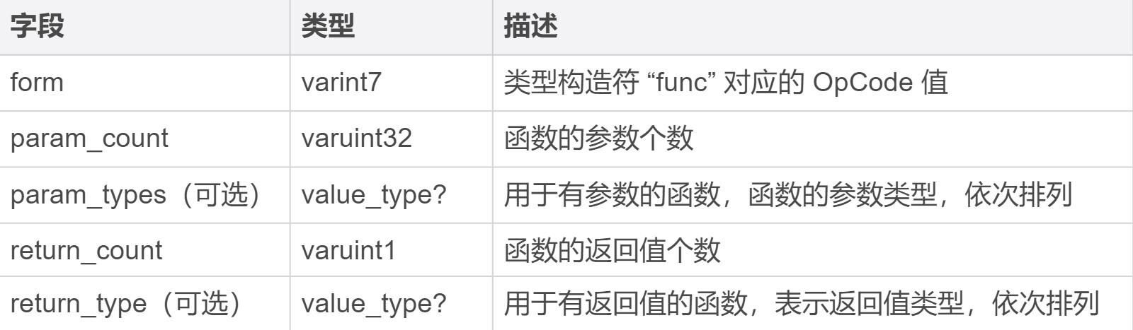 可以看到,Type Section 的有效载荷部分是由一个 count 字段和多个 entries 字段数据组合而成的。其中要注意的是 entries 字段对应的 func_type 类型,该类型是一个复合类型,其具体的二进制组成结构又通过另外的一些字段来描述,具体你可以继续参考我下面这张表。