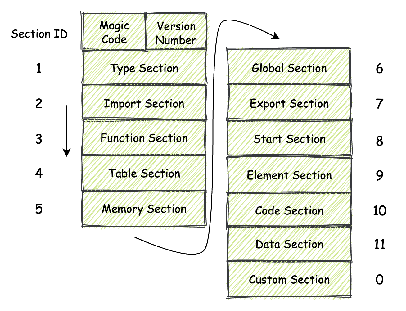 今天我们主要介绍了一个 Wasm 模块在二进制层面的具体组成结构。每一个 Wasm 模块都是由多个不同种类的 Section 组成的,这些 Section 按照其专有 ID 从小到大的顺序被依次摆放着。