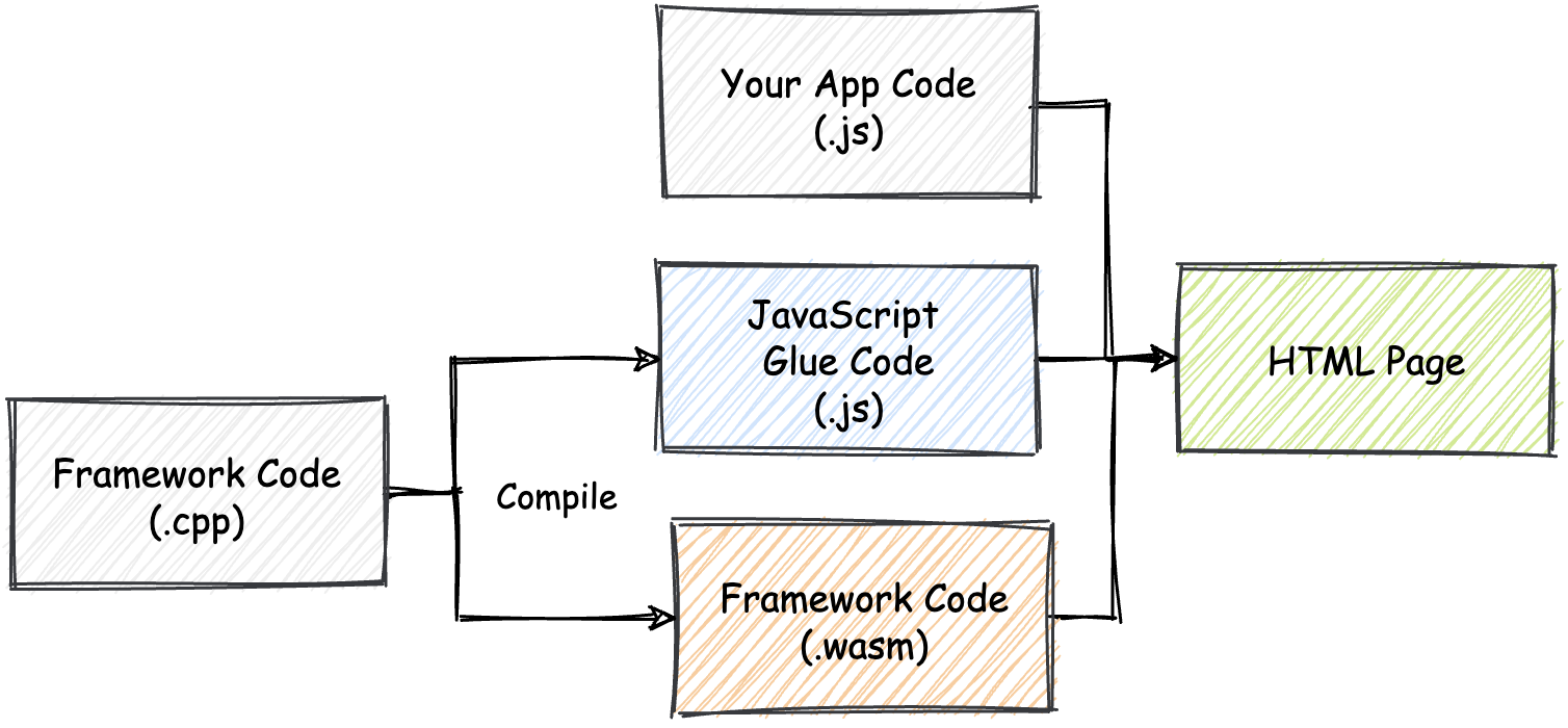 你可以看到,除去样式文件(CSS)以外,我们的 Web 应用程序仅由“框架代码”和“应用程序代码”两部分组成。这两部分代码全部由 JavaScript 语言进行编写。HTML 文件负责将这些 JavaScript 代码整合在一起,并确保在页面加载时执行它们。