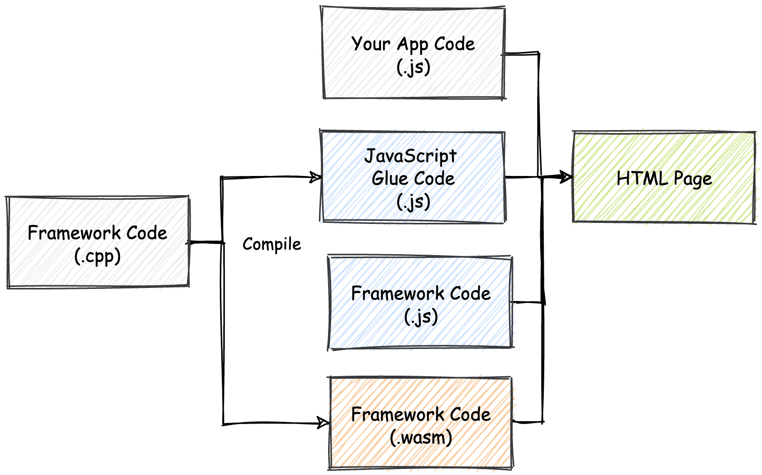 可以看到,这里 Wasm 本身只是作为一个模块,用于优化应用的某方面功能。而 Web 框架本身的源代码组成形式不会发生任何改变,应用仍然还是使用 JavaScript 来构建其主体结构。