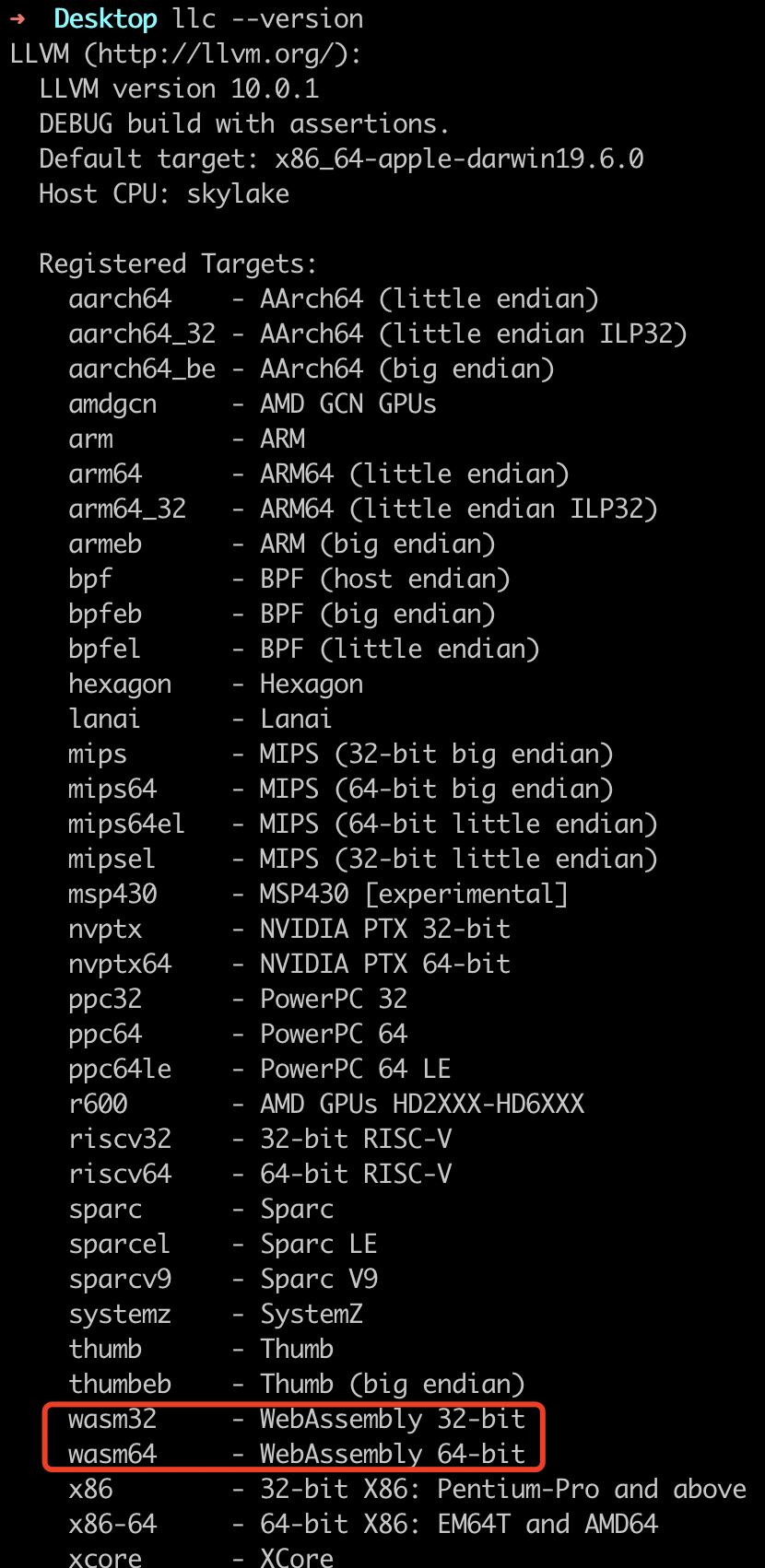 “llc” 是 LLVM 的静态编译器,它可以将输入的 LLVM-IR 代码编译到平台相关的机器码。我们可以通过命令 “llc –version” 来查看它所支持的编译目标平台。如下图所示,我们可以看到其支持名为 “wasm32” 与 “wasm64” 两种 Wasm 的目标平台,这里我们使用第一个 “wasm32”。