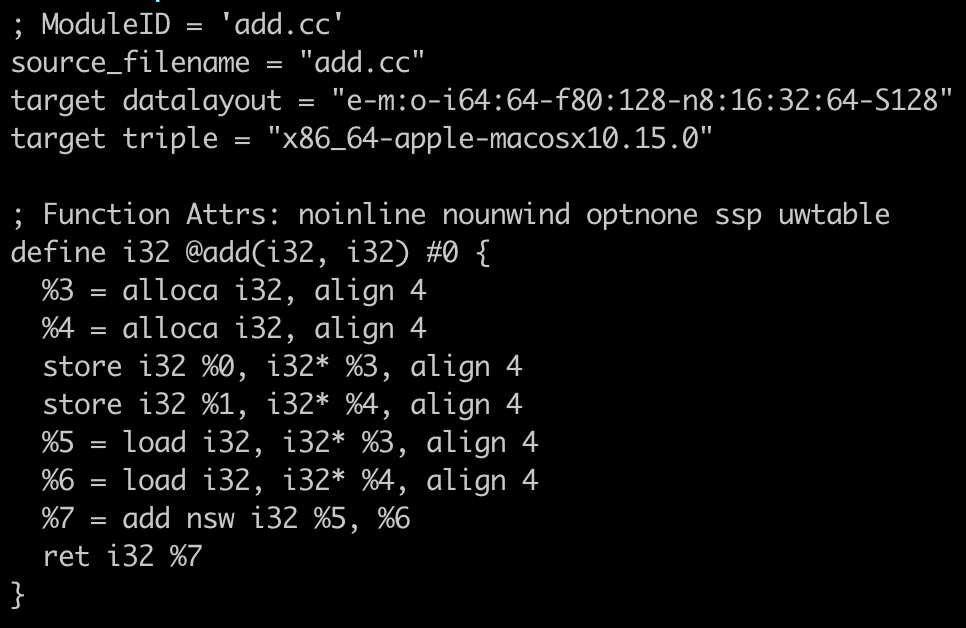其中我们通过指定 “-S” 与 “-emit-llvm” 两个参数,使 Clang 在编译源代码时生成对应的 LLVM-IR 文本格式。命令执行完毕后,我们可以得到一个名为 “add.ll” 的文件。通过文本编辑器打开这个文件,你可以看到如下截图所示的 LLVM-IR 内容。