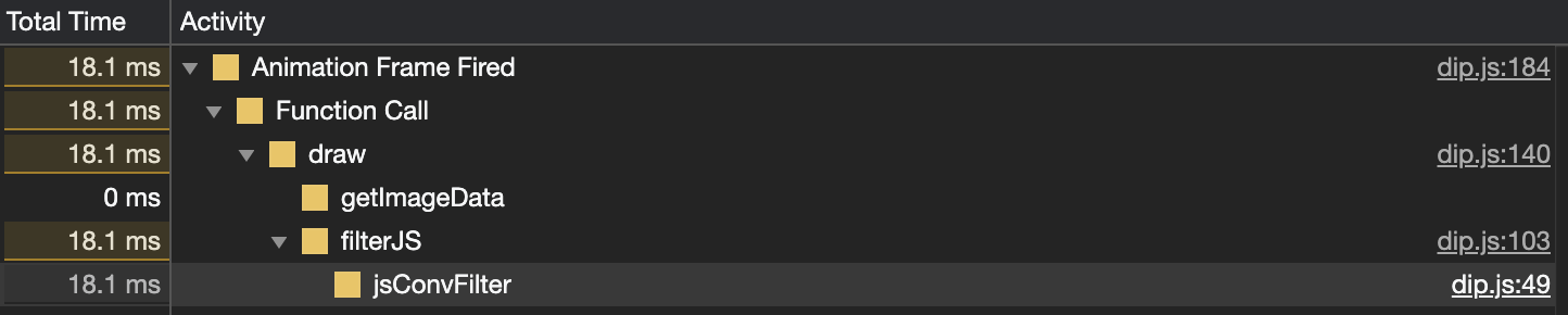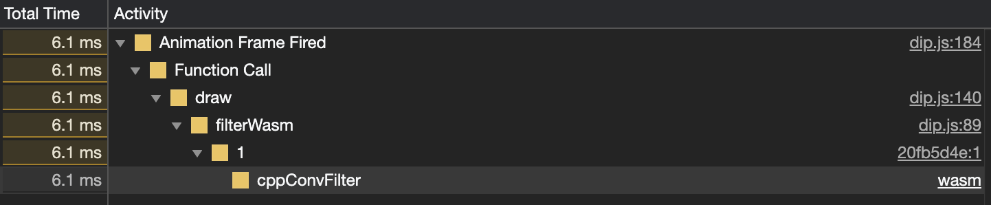 如果再通过 Chrome 的 Performance 工具来查看,jsConvFilter 与 cppConvFilter 这两个分别对应的 JavaScript 滤镜实现与 Wasm 滤镜实现函数的运行耗时,你可以发现如下所示的结果: