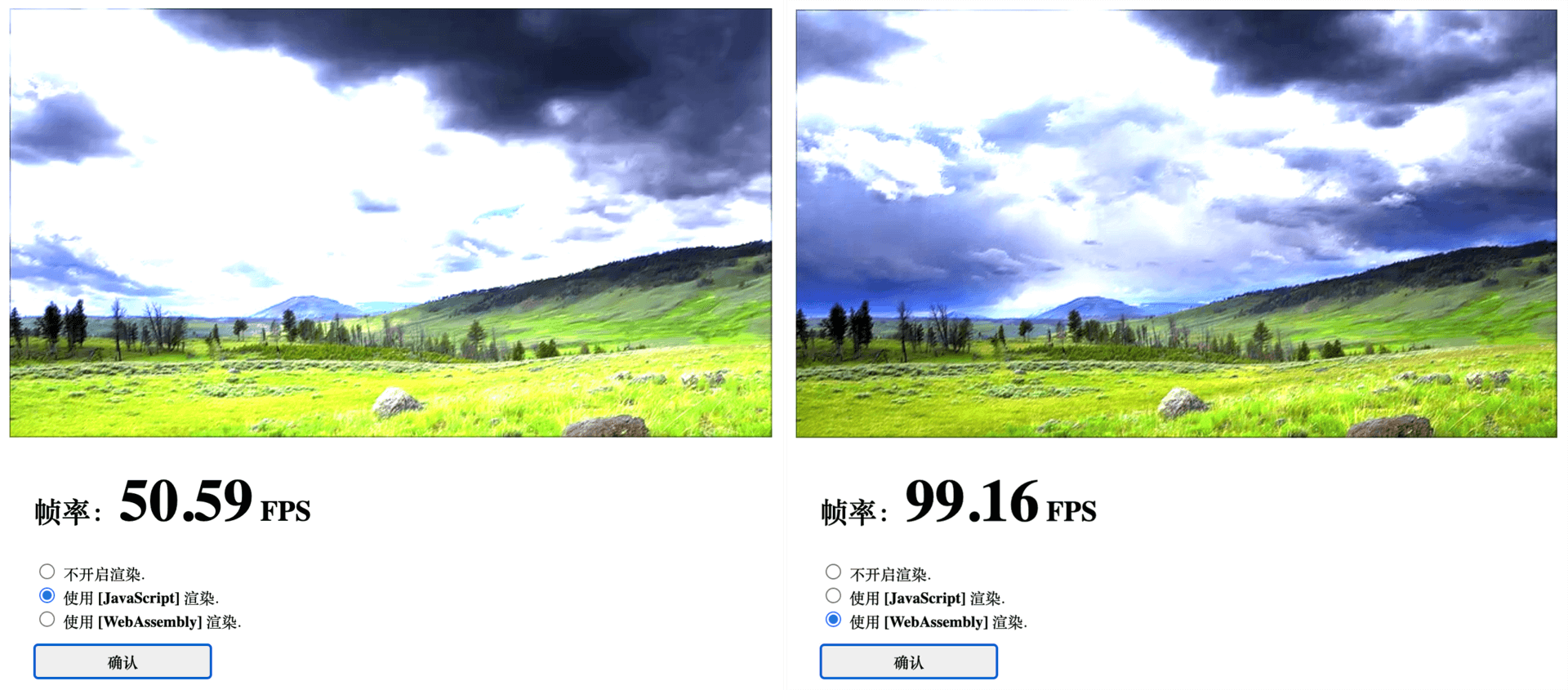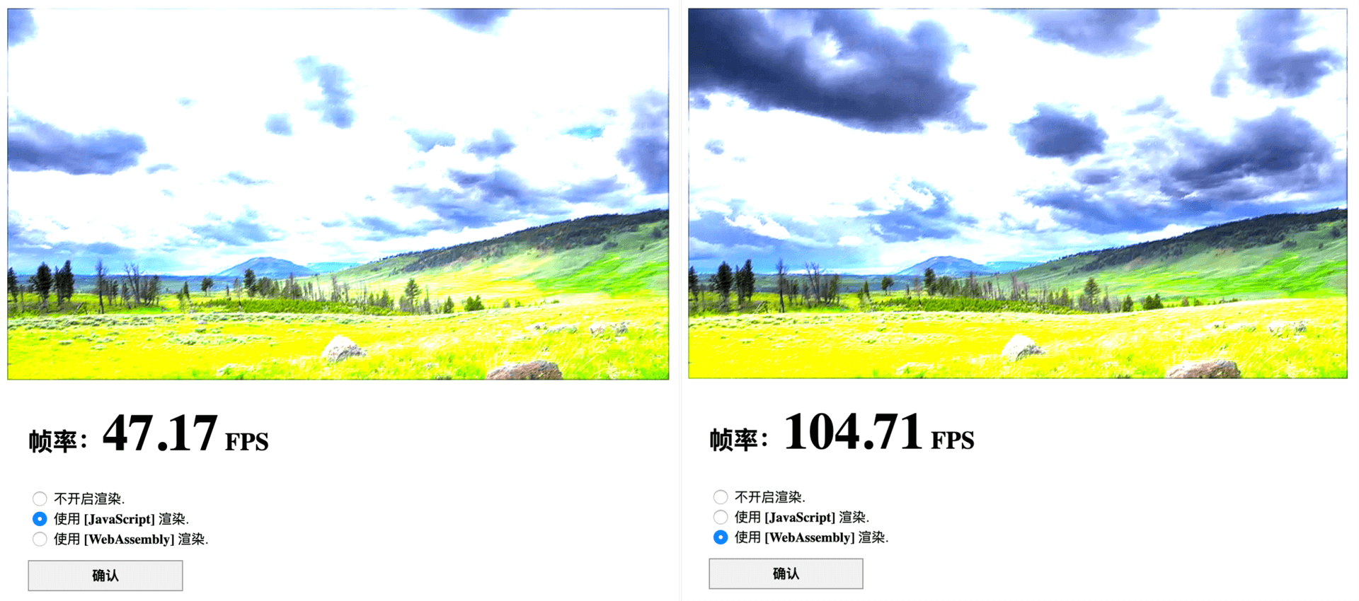 实际测试结果的截图如下所示。其中左侧为 JavaScript 版本滤镜函数,右侧为对应的 Wasm 版本滤镜函数。