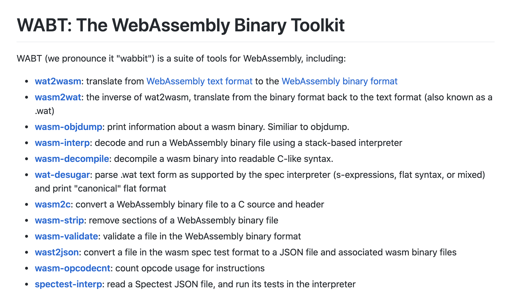 对于其他的 Wasm 相关调试工具,这里主要推荐你使用 “WABT” 。关于这个工具集,我在文章 06 中曾提到过。WABT 内置了众多可以直接对 Wasm 字节码或者 WAT 可读文本代码进行转换和分析的工具。比如用于将 WAT 格式转换为 Wasm 字节码的工具 “wat2wasm”、用于将 WAT 转换为 Flat-WAT 的工具 “wat-desugar” 等等。