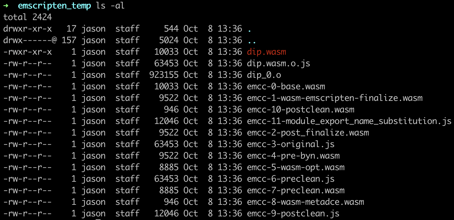 这里命令行中设置的环境变量 “EMCC_DEBUG” 支持三个值:0、1 与 2。其中 “0” 表示关闭调试模式,也就是默认不加该环境变量时的情况;“1” 表示输出编译时的调试性信息,同时生成包含有编译器各个阶段运行信息的中间文件。这些输出信息和文件可用于对整个 emcc 编译流程的各个步骤进行调试。以下为 emcc 的编译输出信息及所生成中间文件的截图。