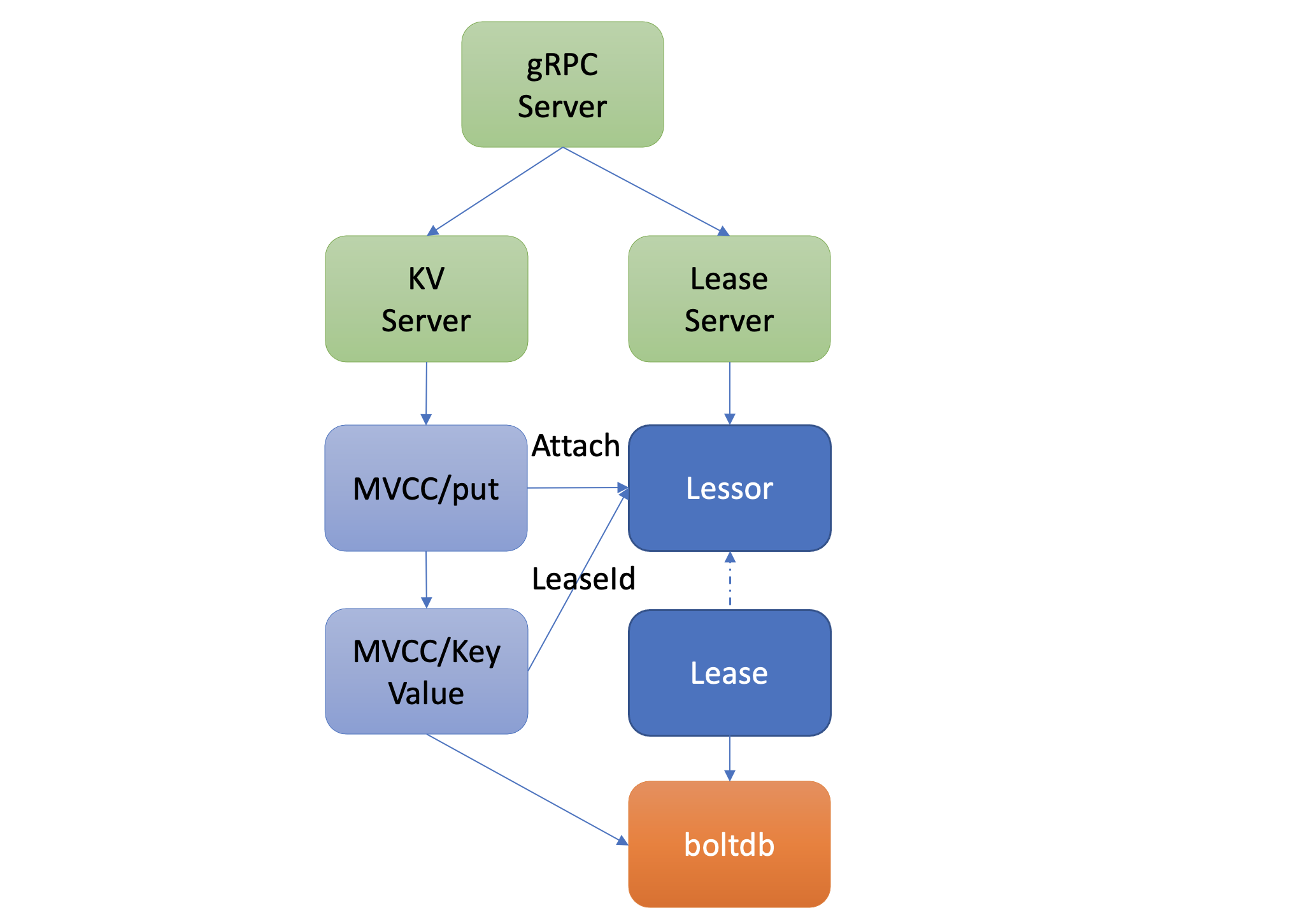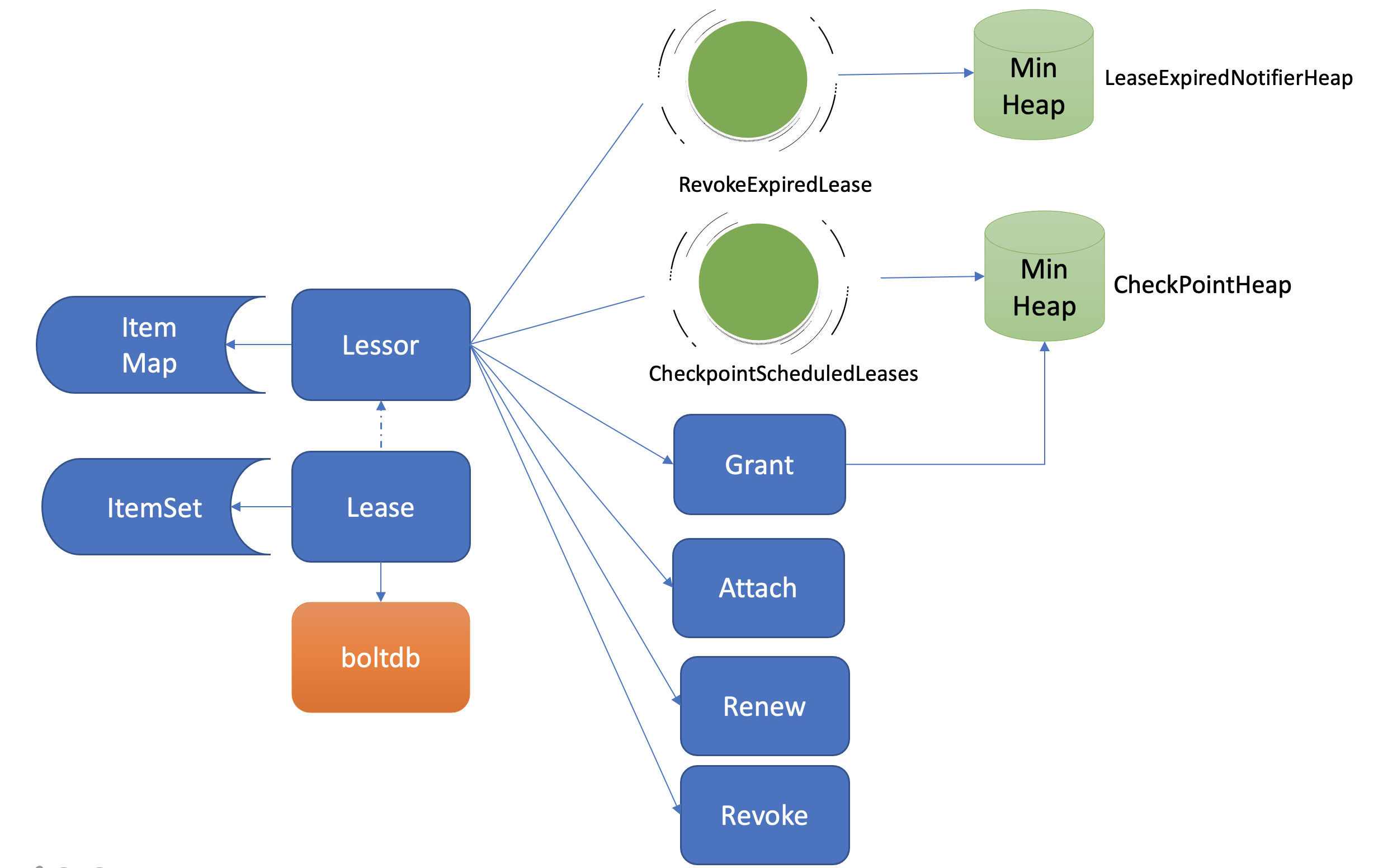 以上流程原理如下图所示,它描述了用户的key是如何与指定Lease关联的。当你通过put等命令新增一个指定了”–lease”的key时,MVCC模块它会通过Lessor模块的Attach方法,将key关联到Lease的key内存集合ItemSet中。