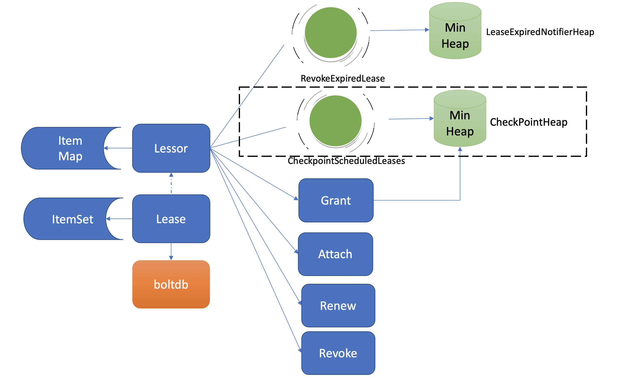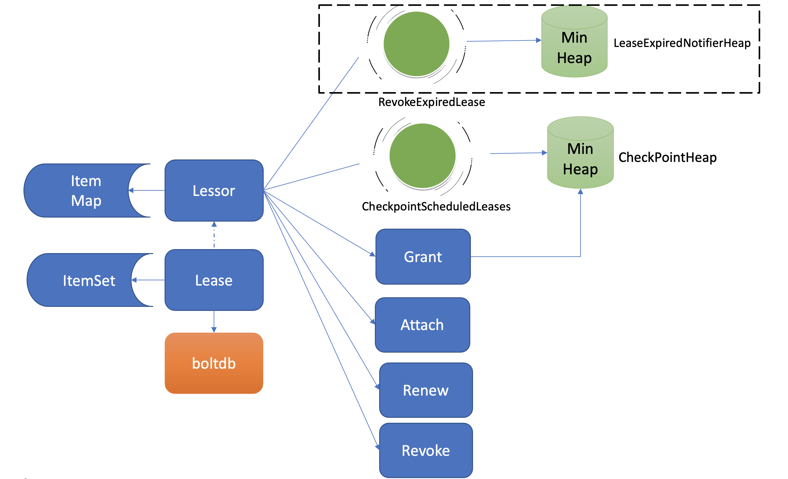 淘汰过期Lease的工作由Lessor模块的一个异步goroutine负责。如下面架构图虚线框所示,它会定时从最小堆中取出已过期的Lease,执行删除Lease和其关联的key列表数据的RevokeExpiredLease任务。