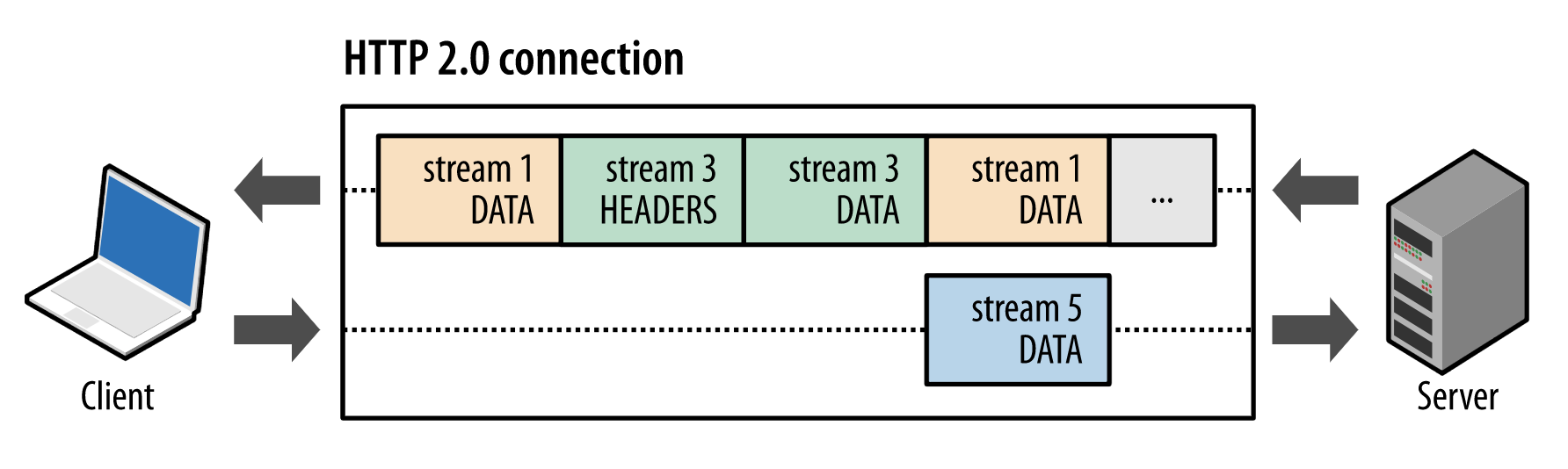 如上图所示,client正在向server发送数据流5的帧,同时server也正在向client发送数据流1和数据流3的一系列帧。一个连接上有并行的三个数据流,HTTP/2可基于帧的流ID将并行、交错发送的帧重新组装成完整的消息。